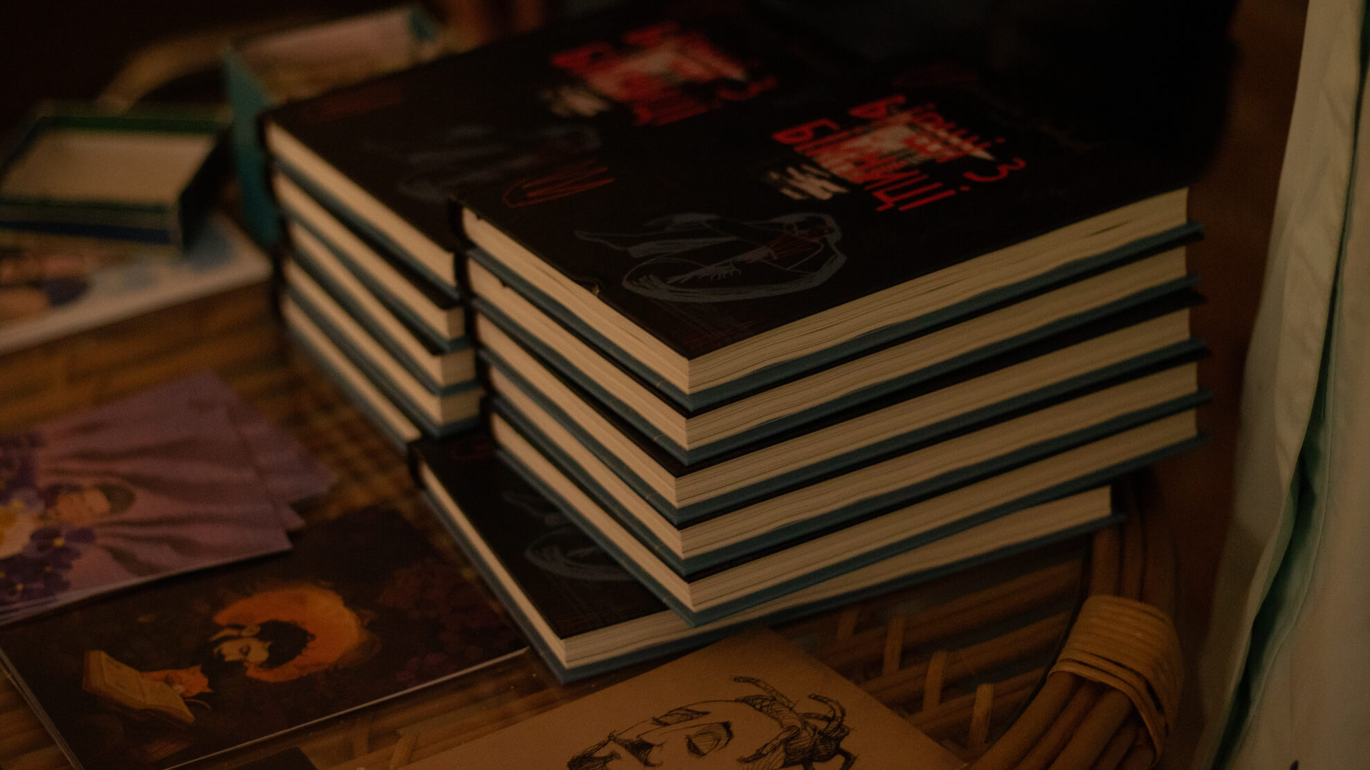 У кутку зали є столик, де люди обмінюють гроші на книжки та інші сувеніри від фонду пам’яті Максима Кривцова. Дивлячись на це, Іванна додає: “Якщо ви зараз не маєте грошей, ви можете купити мерч або книгу на сайті фонду імені Максима. Всі гроші йдуть у фонд пам’яті Кривцова”.