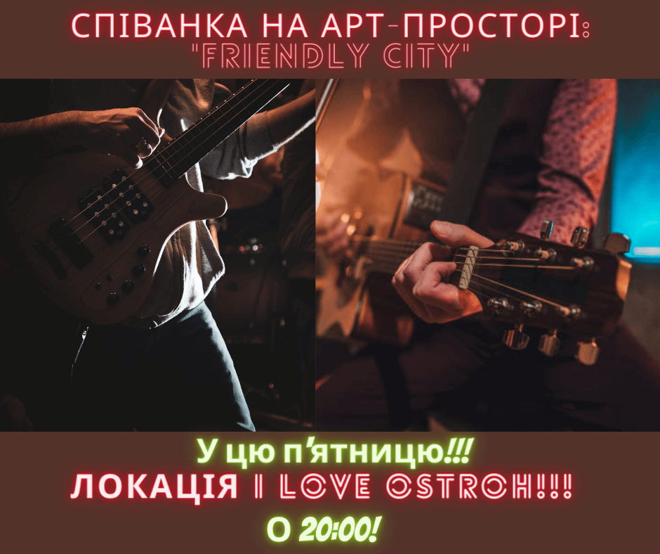 Співанку для молоді проведуть в новому арт-просторі “Friendly city” (сквер Перемоги) 20 серпня. Про це повідомив відділ проєктно-інвестиційної діяльности Острозької міської ради. Що: молодіжна співанка. Де: сквер Перемоги (поблизу “I love Ostroh”). Коли: 20 серпня (п’ятниця) о 20.00. Ми забезпечимо вас смаколиками, якісною українською музикою та незабутньою атмосферою“, – повідомляє проєктно-інвестиційний відділ. Деталі за покликанням.
