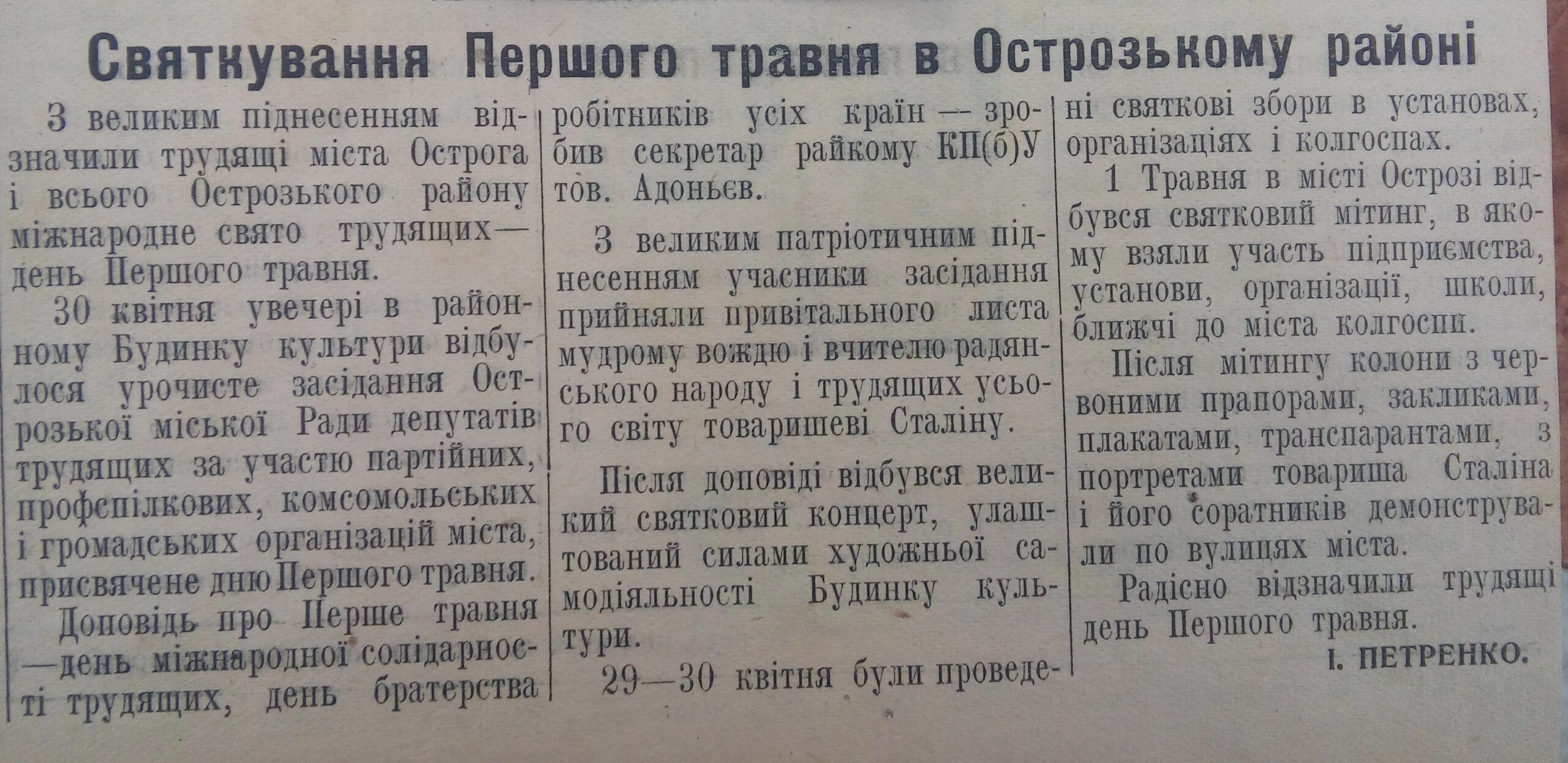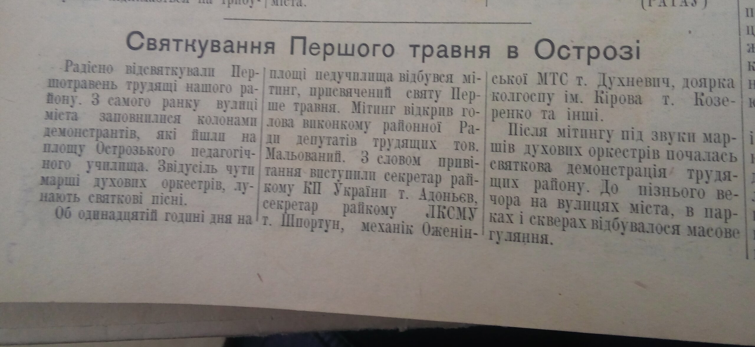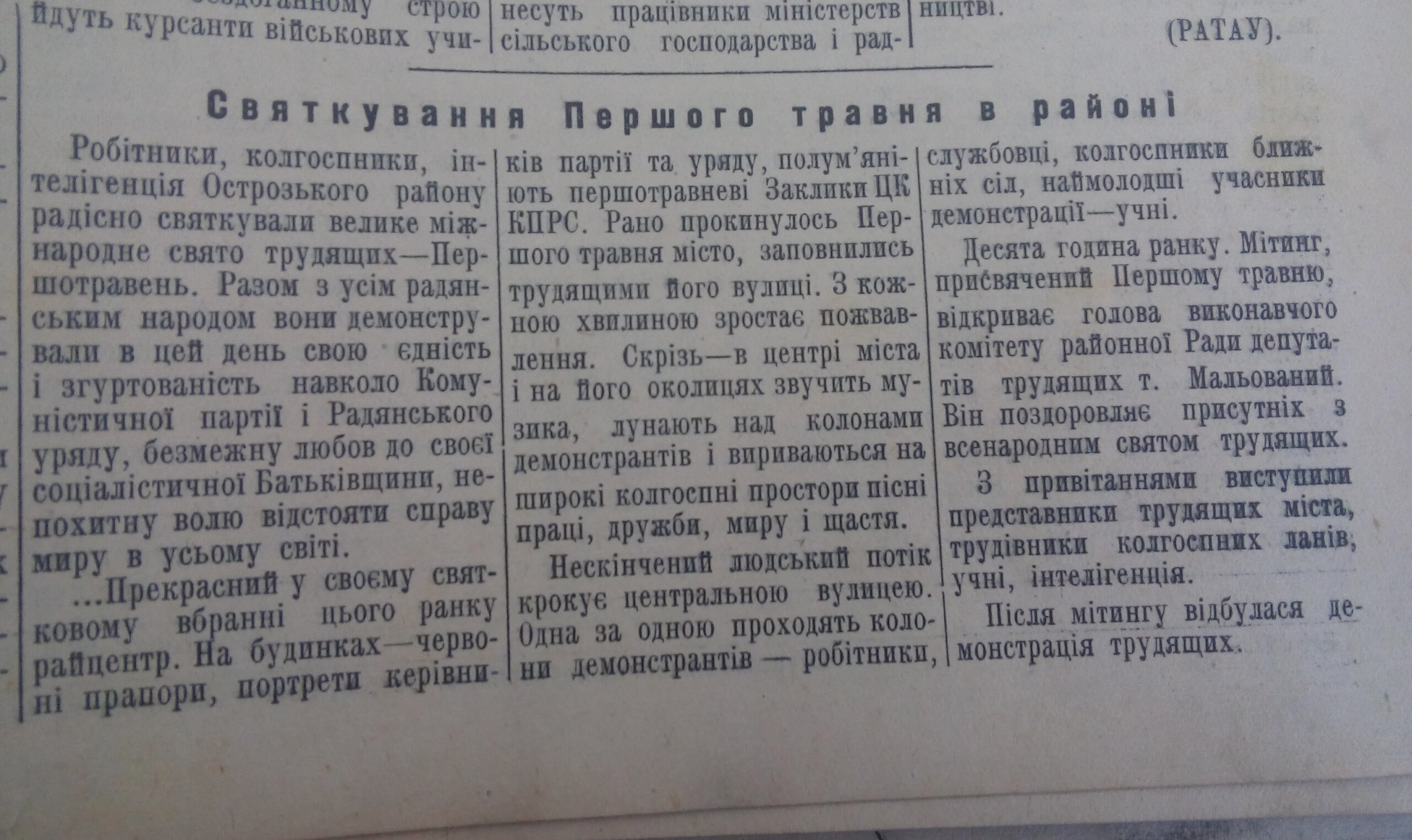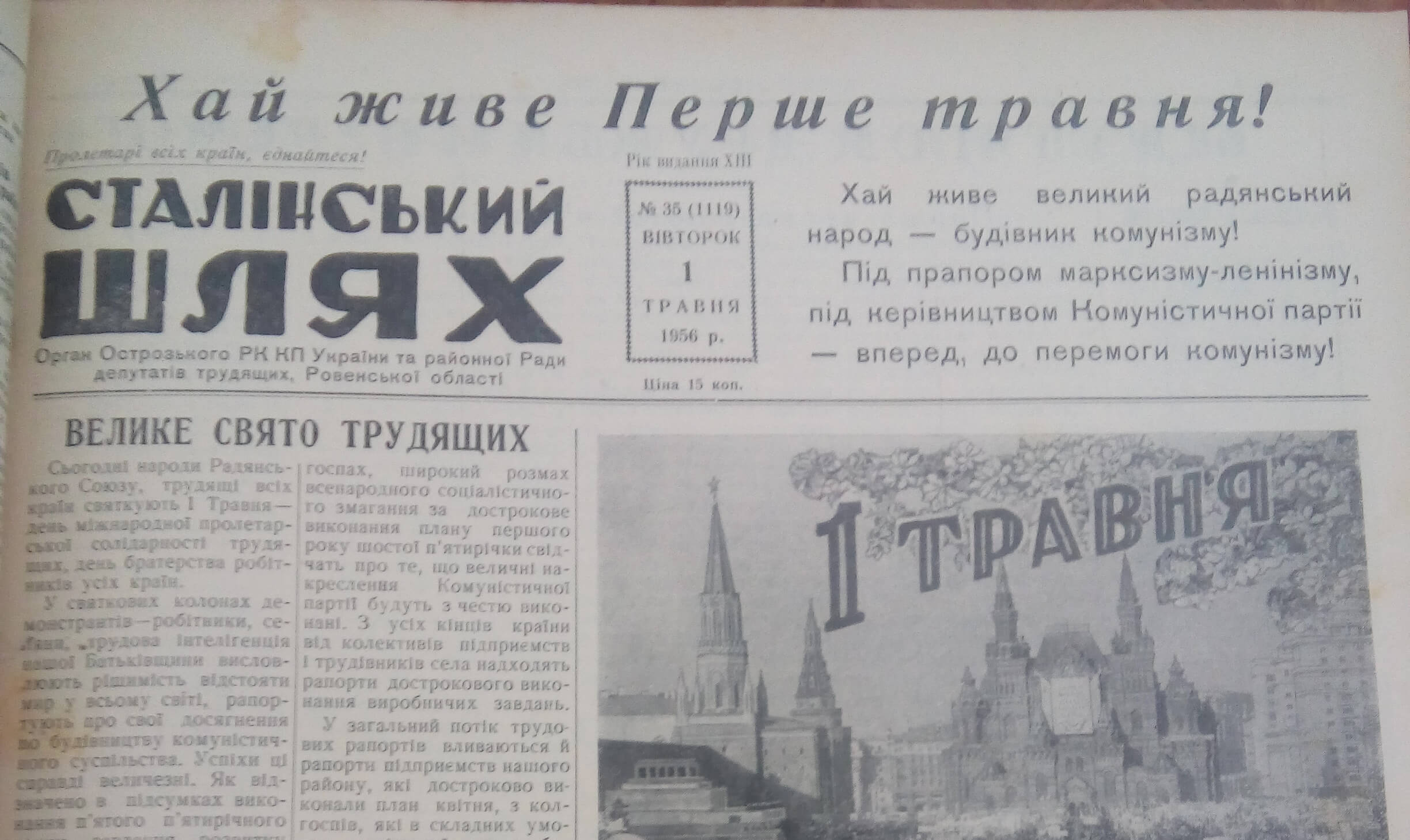 Першотравневі свята для багатьох українців – це всього лише два додаткових вихідних дні, аби відпочити та сходити та пікнік. Проте 60 років тому острожани святкували по-іншому, принаймні тогочасні журналісти писали, що “робітники, колгоспники, інтелігенція Острозького району радісно святкували велике міжнародне свято трудящих – Першотравень. Разом із усім радянським народом вони демонстрували в цей день свою єдність та згуртованість навколо Комуністичної партії та Радянського уряду, безмежну любов до своєї соціалістичної Батьківщини, непохитну волю відстояти справу миру в усьому світі”. Нам вдалося знайти підшивку районної газети за 1954-1956 роки. “Погортати” сторінки раритету пропонуємо і нашим читачам.