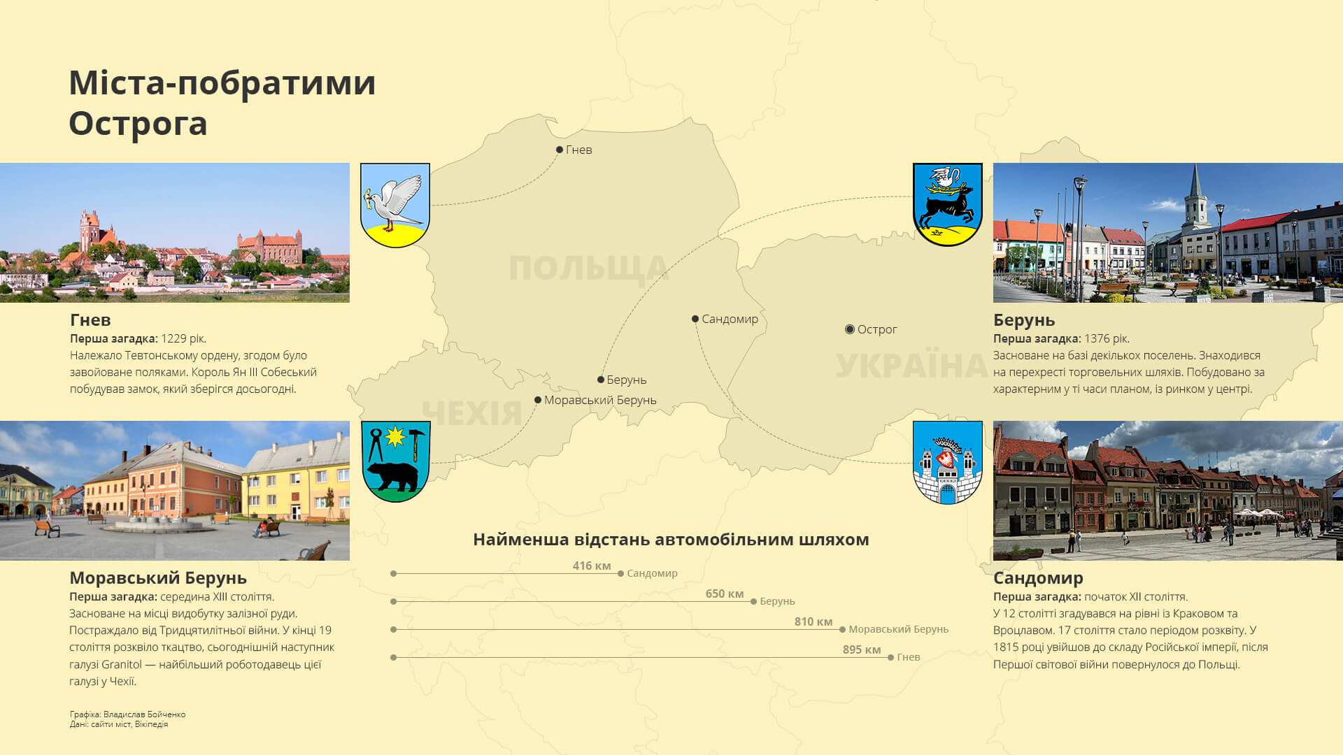 В Острога 4 побратими: польські Сандомир, Берунь і Гнев та чеський Моравський Берунь. Міста-побратими приблизно того ж віку, що й Острог, а також мають приблизно однакову чисельність населення. Найдалі від нас польський Гнев — у 895 кілометрах, та дібратися його швидше, ніж Луганська, до якого найкоротший автомобільний шлях від Острога більш ніж 1000 кілометрів. Найближче — Сандомир.