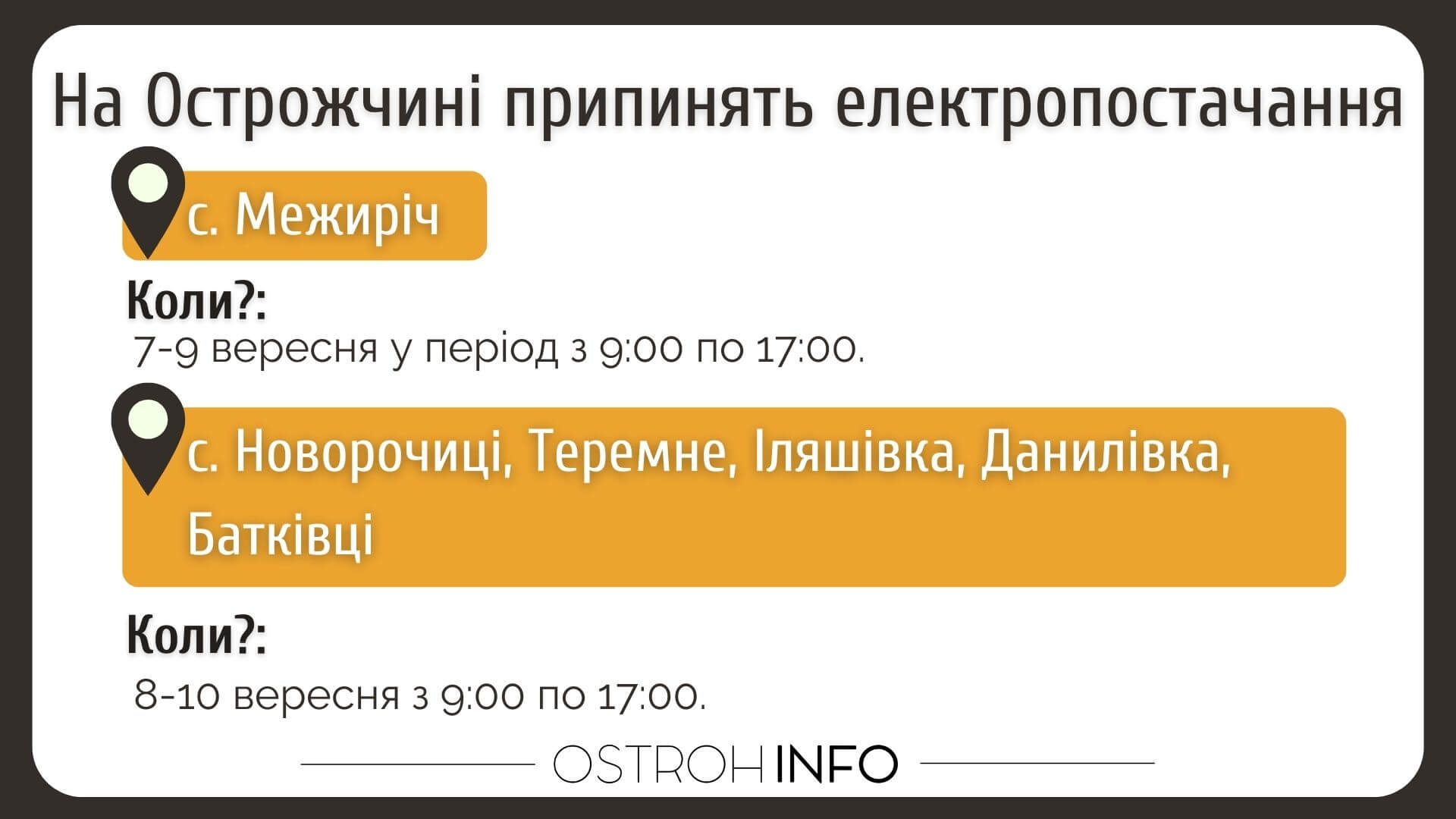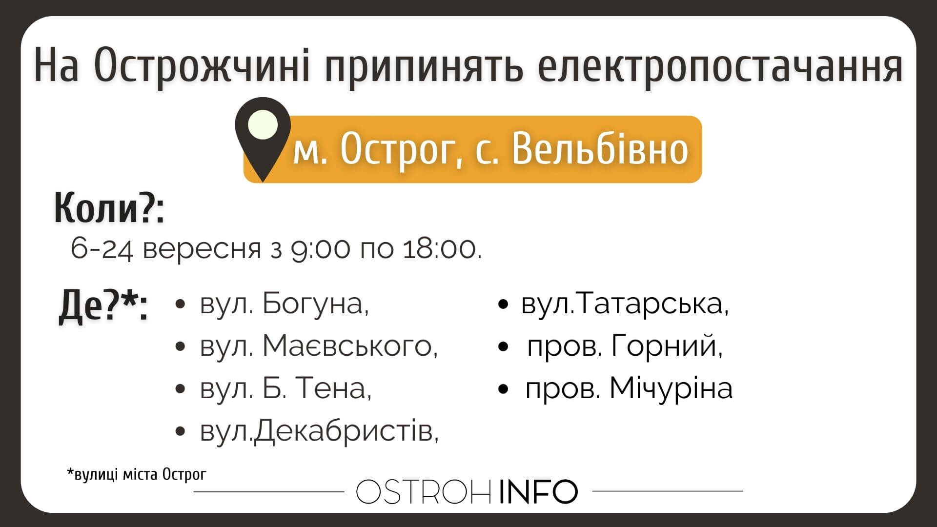 Планові відключення електропостачання на Острожчині триватимуть з 6 по 24 вересня.