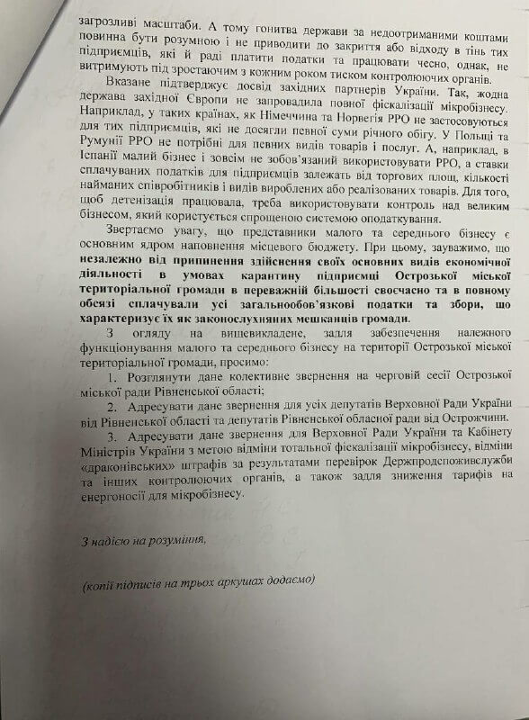 Крім того, документ адресували до депутатів Острожчини у Рівненській обласній раді і всіх депутатів Рівненщини у Верховній раді, а також до Кабінету Міністрів та Верховної Ради.