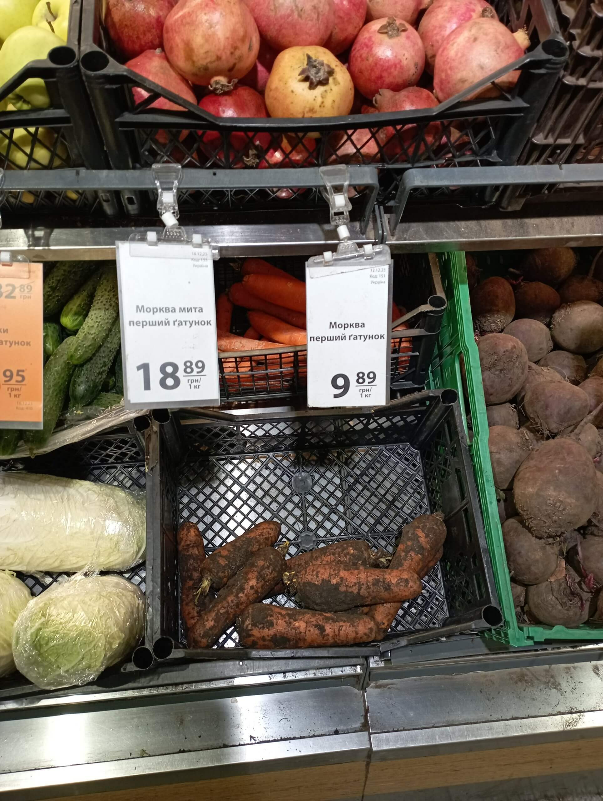- В “АТБ-Маркеті” цибуля обійдеться у 19,59 грн за кілограм, картопля — у 22,79 грн, буряк — 10,89 грн, немита морква — 9,89, але мита вартуватиме 18,89 грн за кг, капуста ж — 11,95 грн.