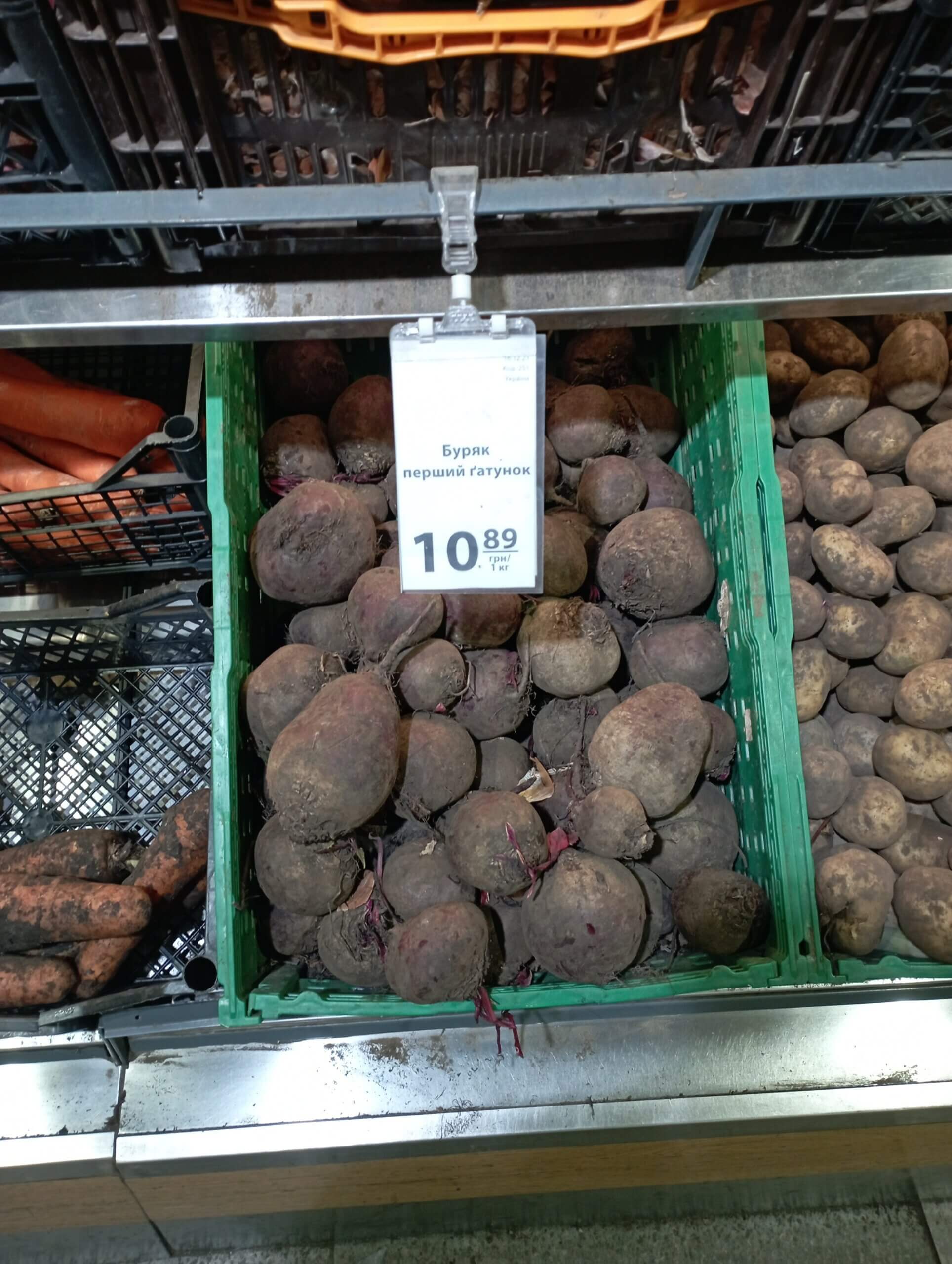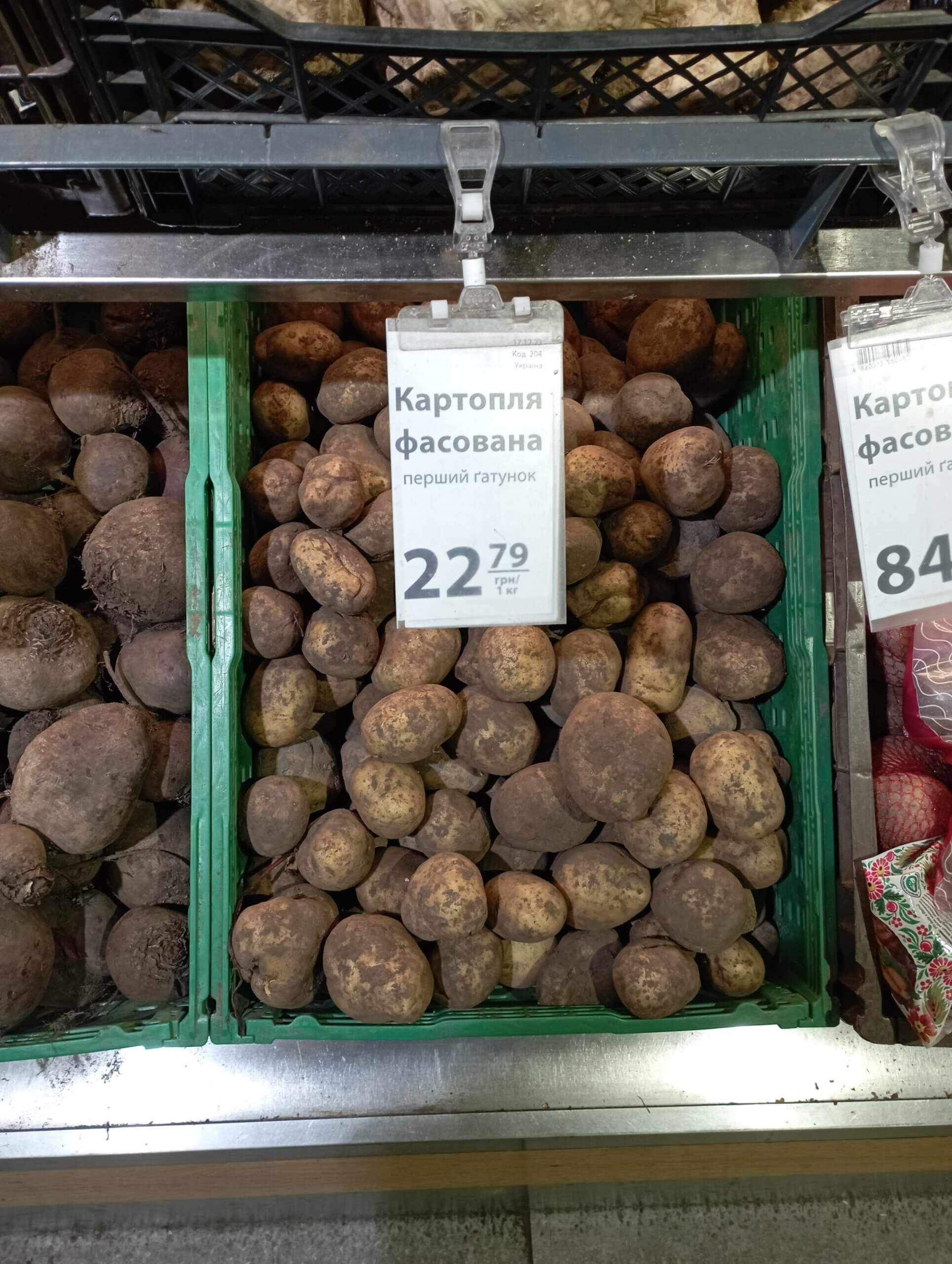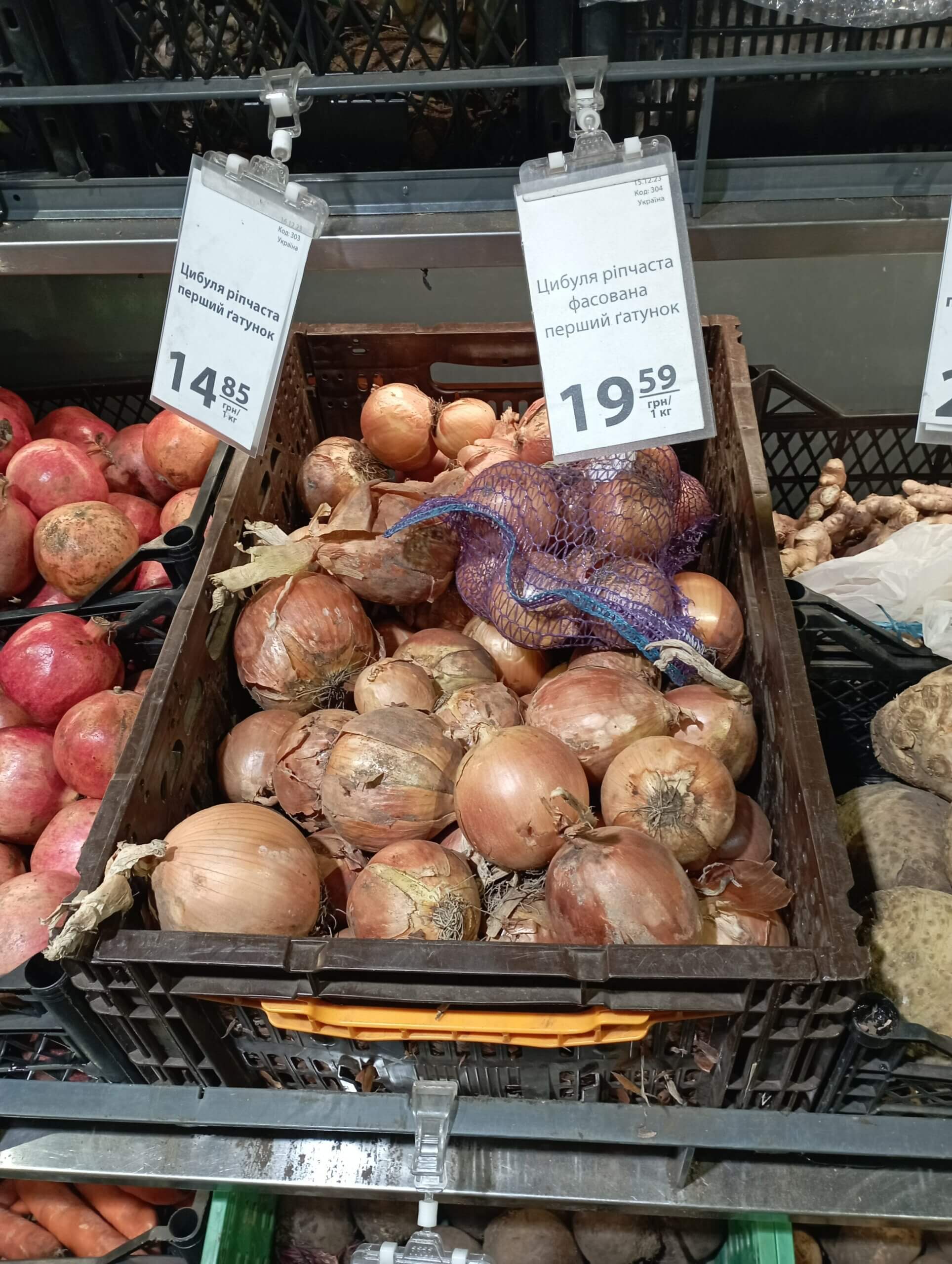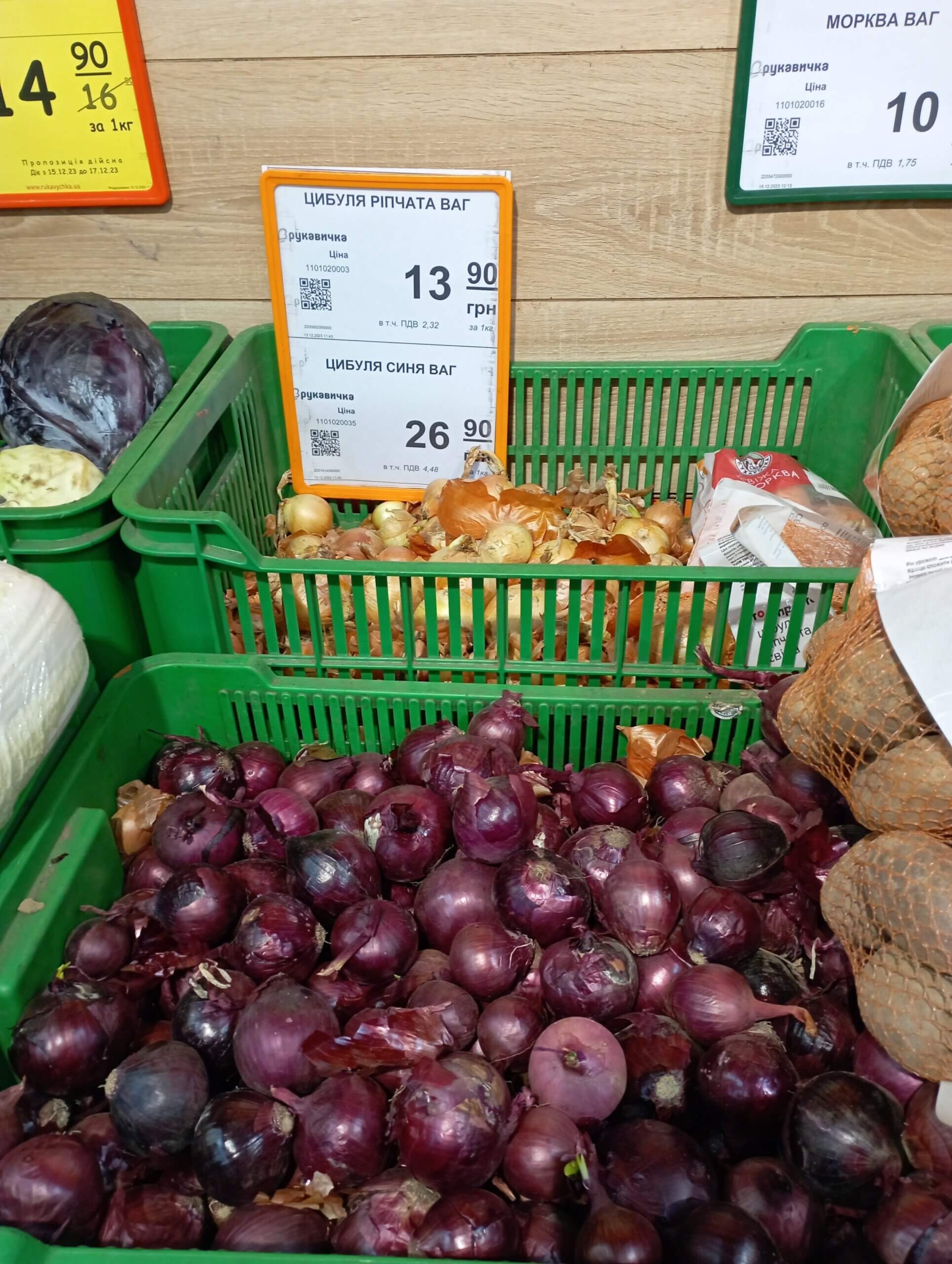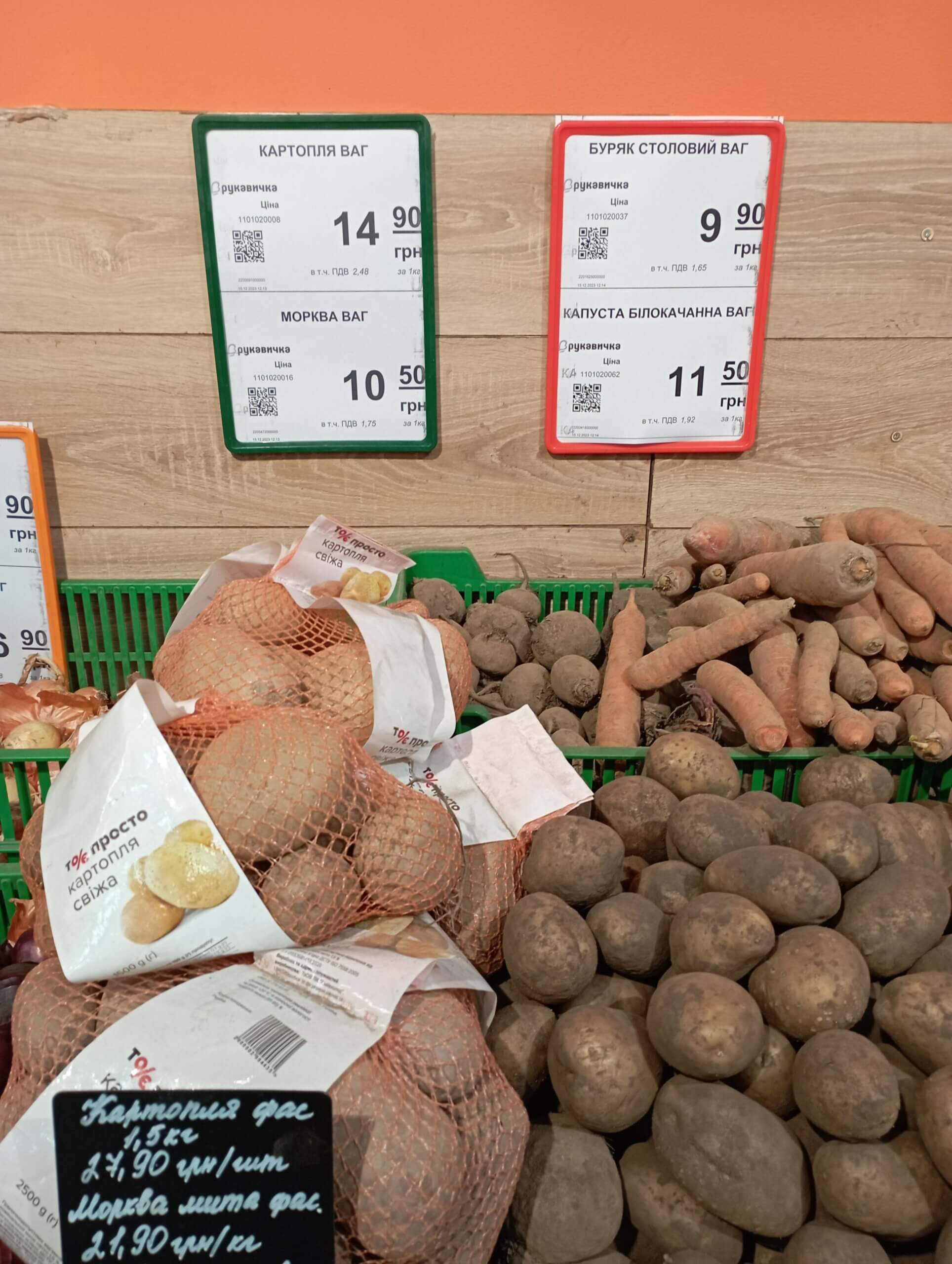 - У “Рукавичці” цибуля ріпчаста вартує 13,90 грн за кг, синя цибуля — 26,90 грн за кг, картопля — 14,90 грн за кг, а фасована — 27,90 грн за 1,5 кг, буряк коштує 9,90 грн за кг, а морква — 10,50 грн.