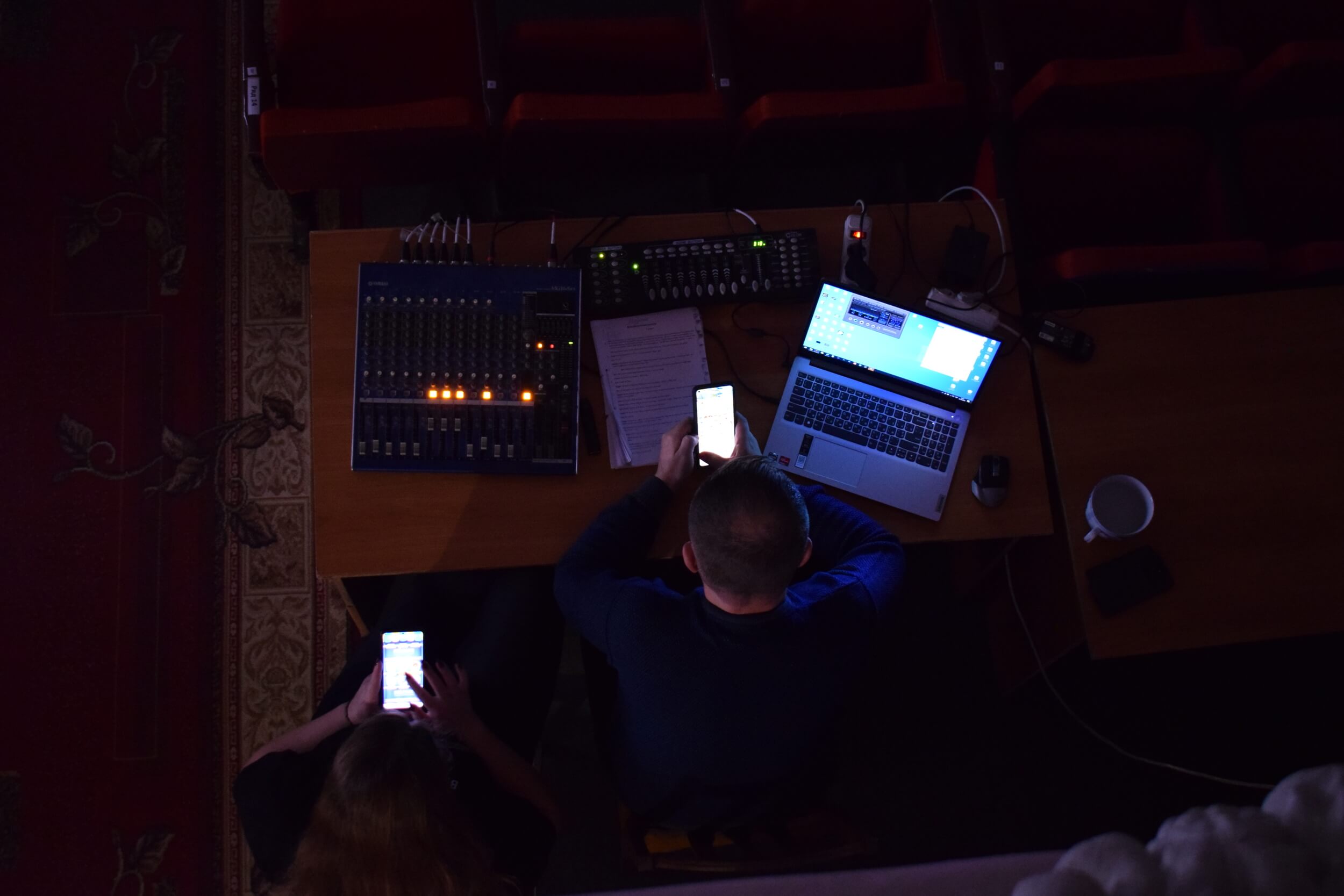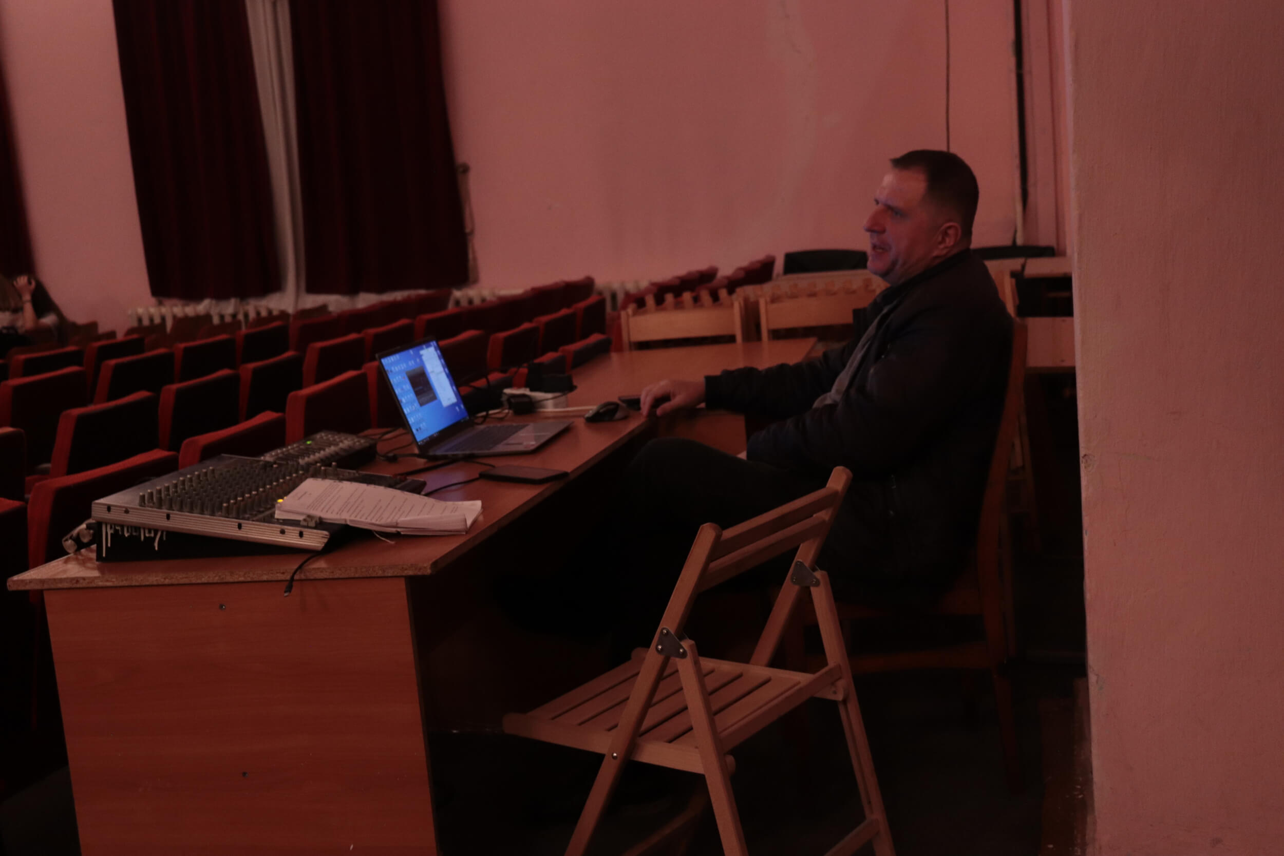 У кінці зали видніється звукооператор команди, який налаштовує апаратуру та переглядає сценарій сьогоднішньої вистави.