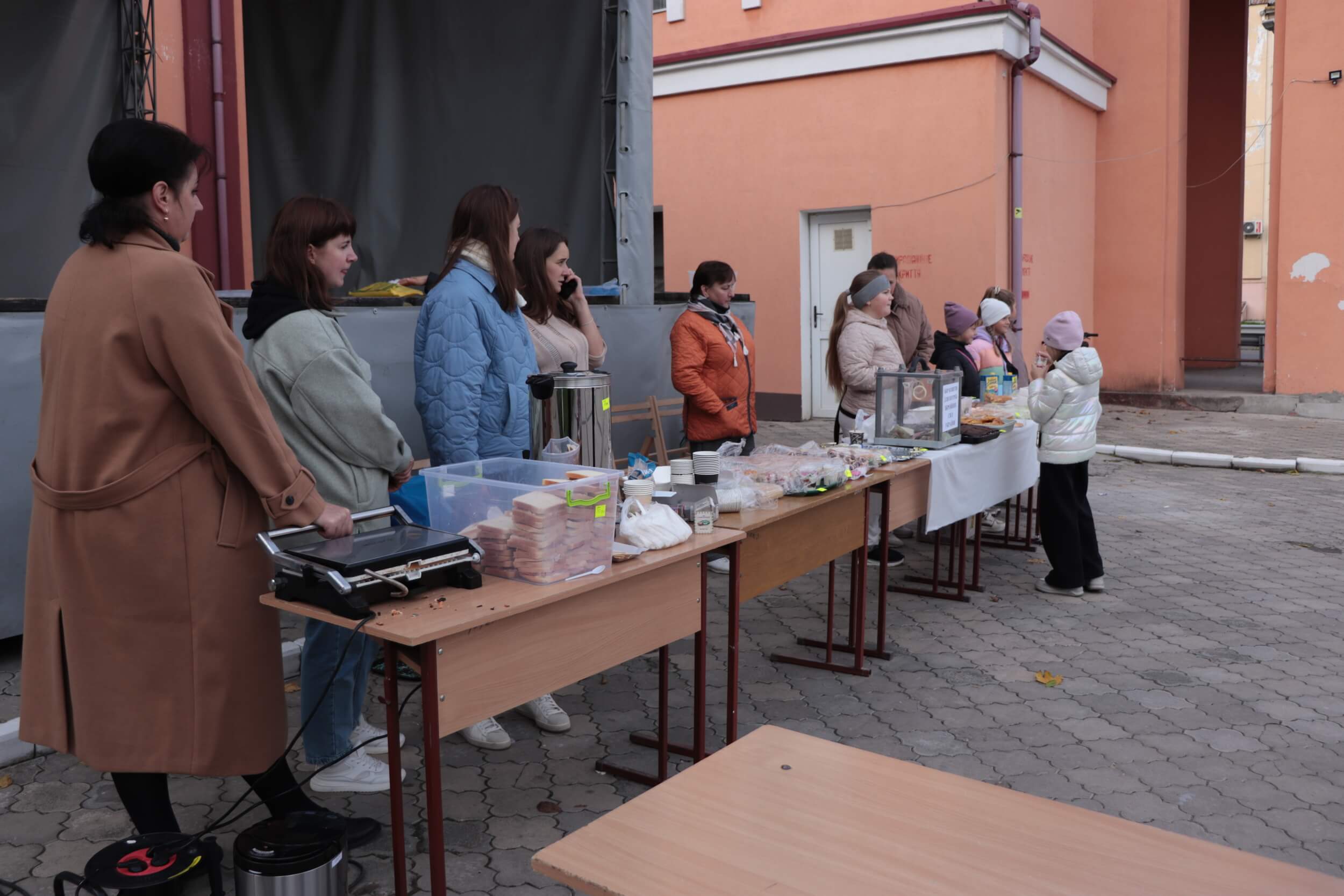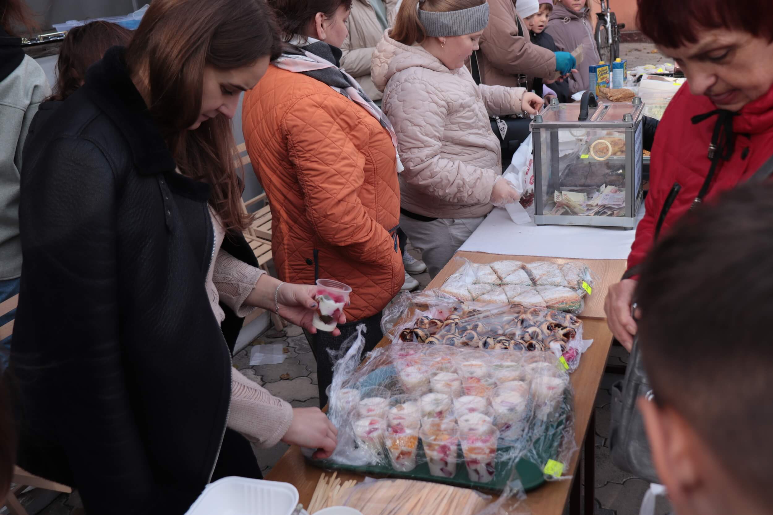 Серед їжі можна побачити великий прозорий пластиковий куб, який вже починає наповнюватись купюрами — туди кладуть зібрані кошти, які підуть на підтримку українських військових.
