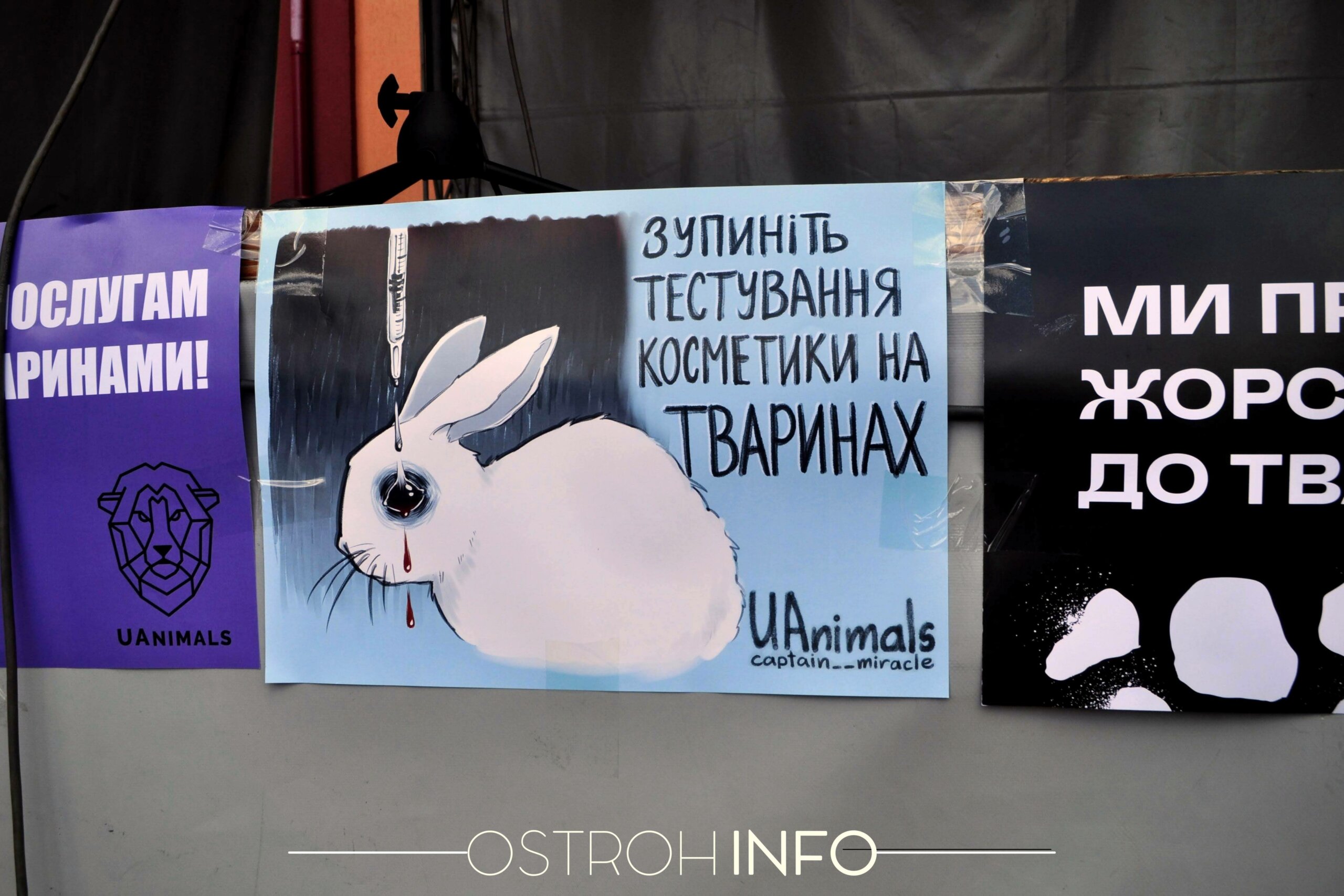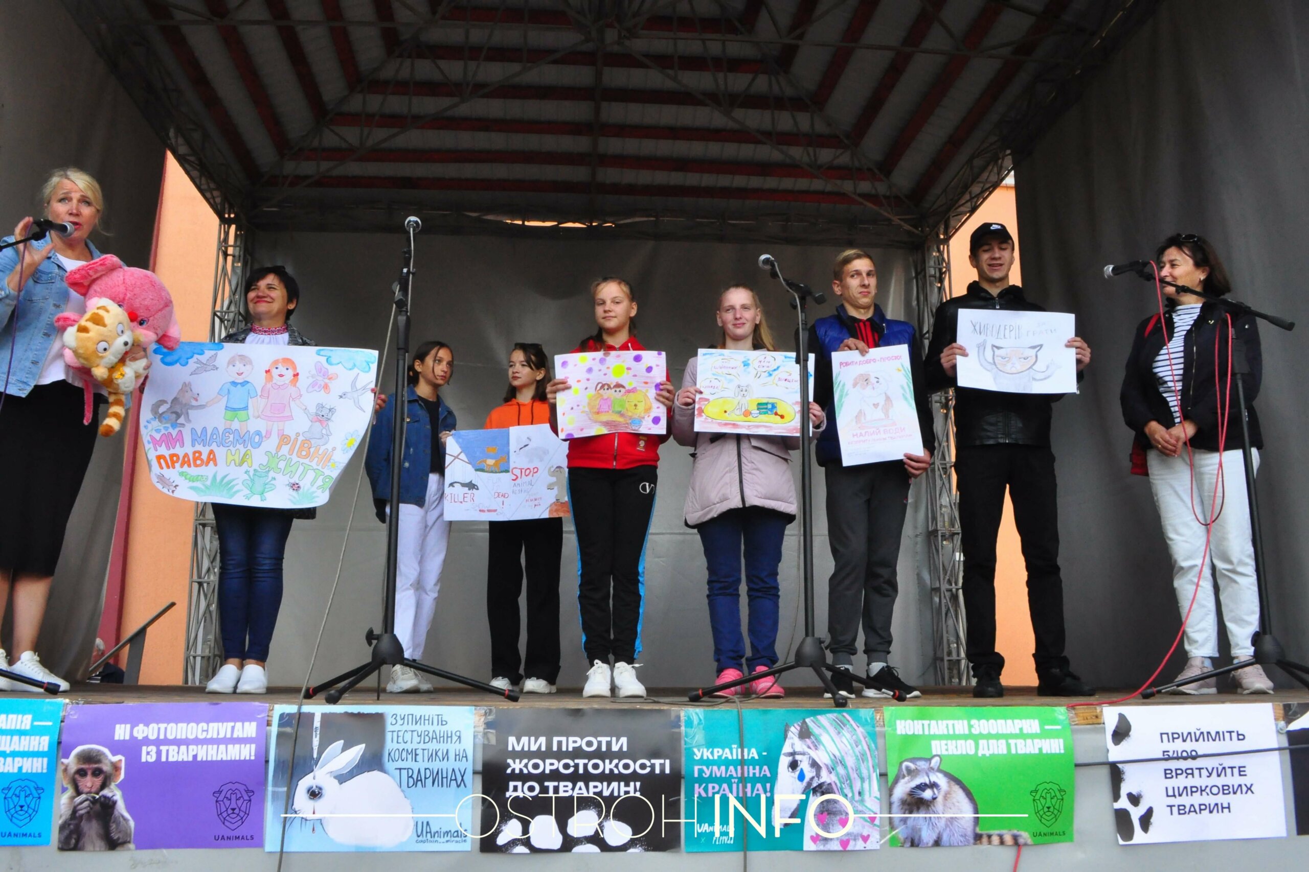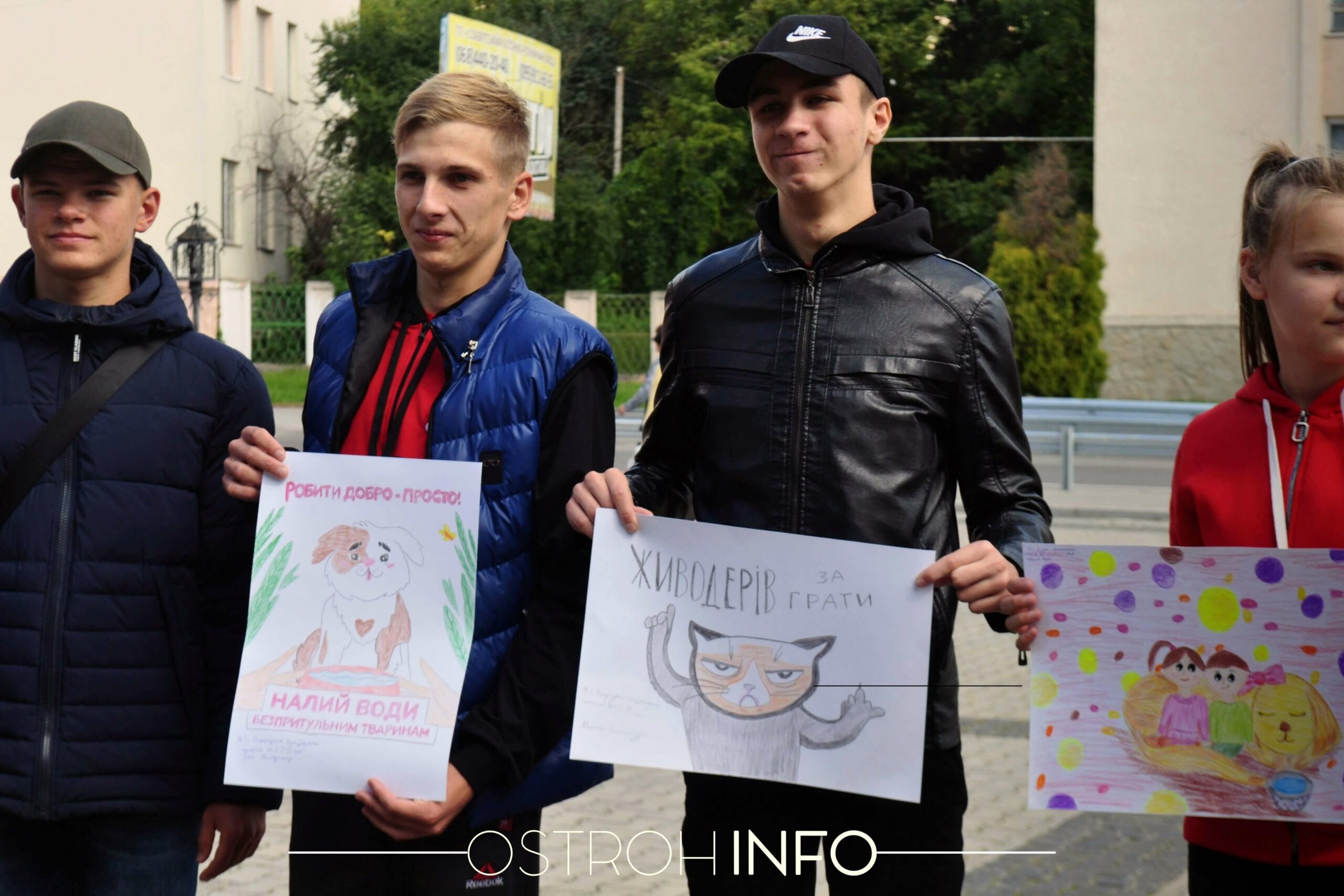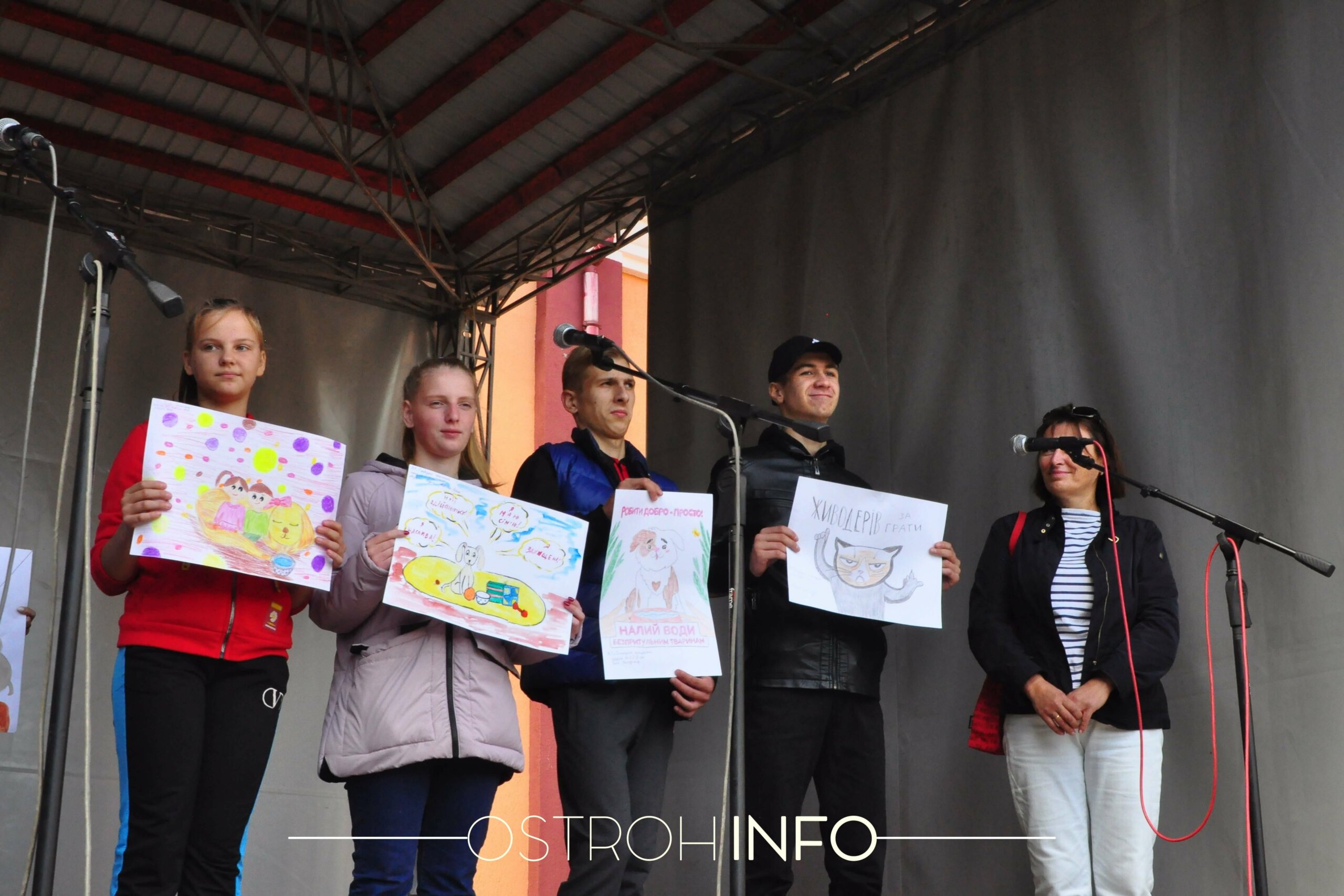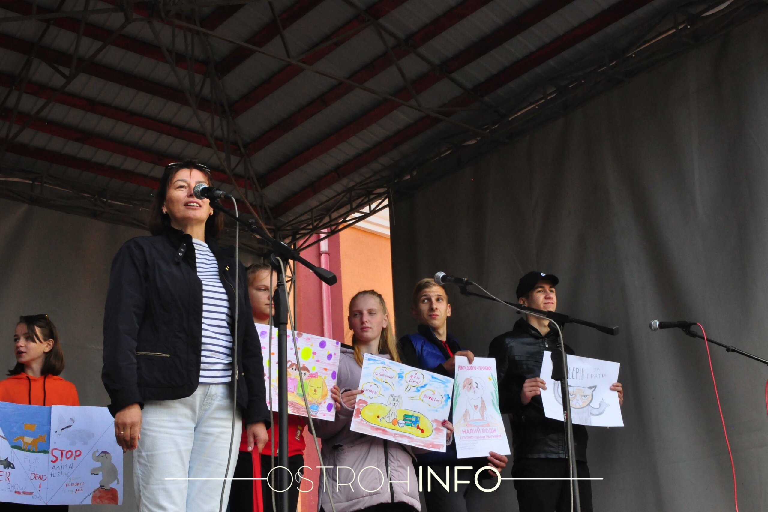 Сонячно, хоча вже й п’яте вересня. Обідній час, на площі біля Будинку культури зібралося близько двадцяти людей і дві собаки. З колонок голосно лунає музика, попід сценою розвішані плакати. Сьогодні в Острозі відбувається акція в підтримку прав тварин.