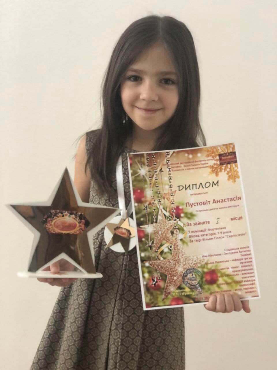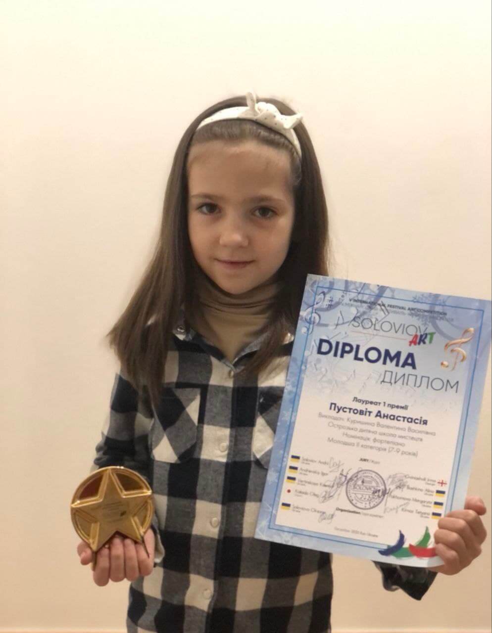 Учениця першого класу Анастасія Пустовіт посіла І місце у Міжнародному фестивалі-конкурсі мистецтв “SOLOVIOV ART” та І місце у Всеукраїнському фестивалі-конкурсі “Золоті таланти України”.