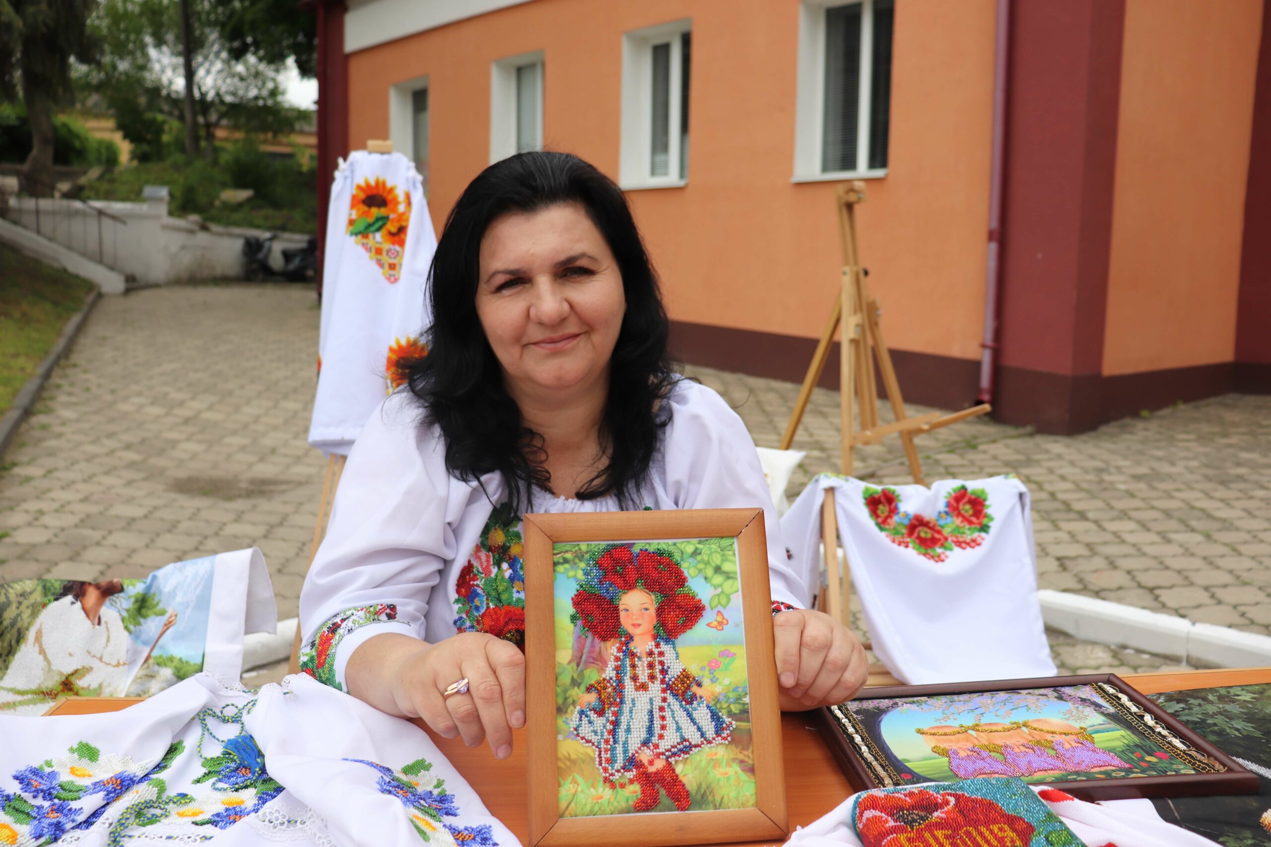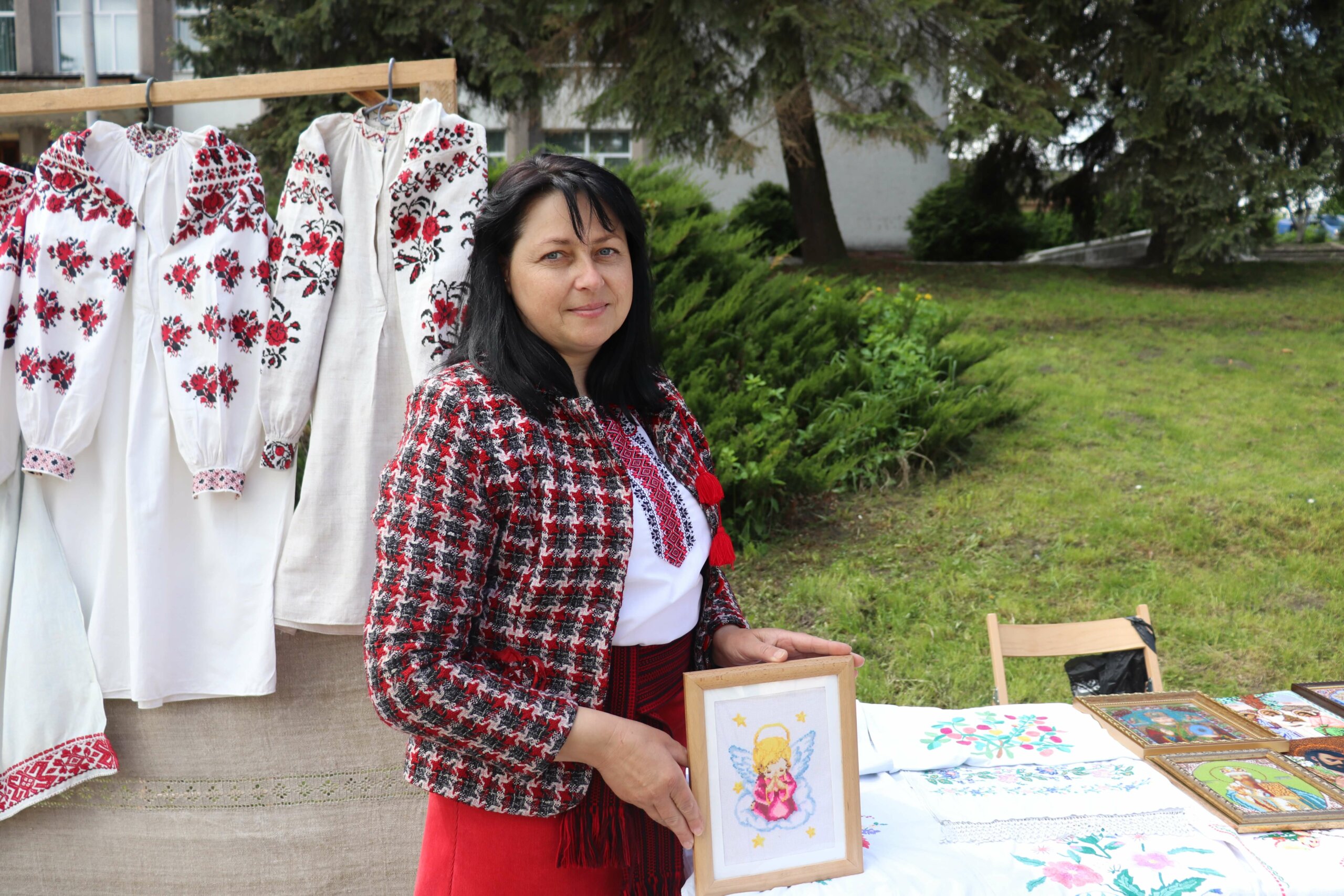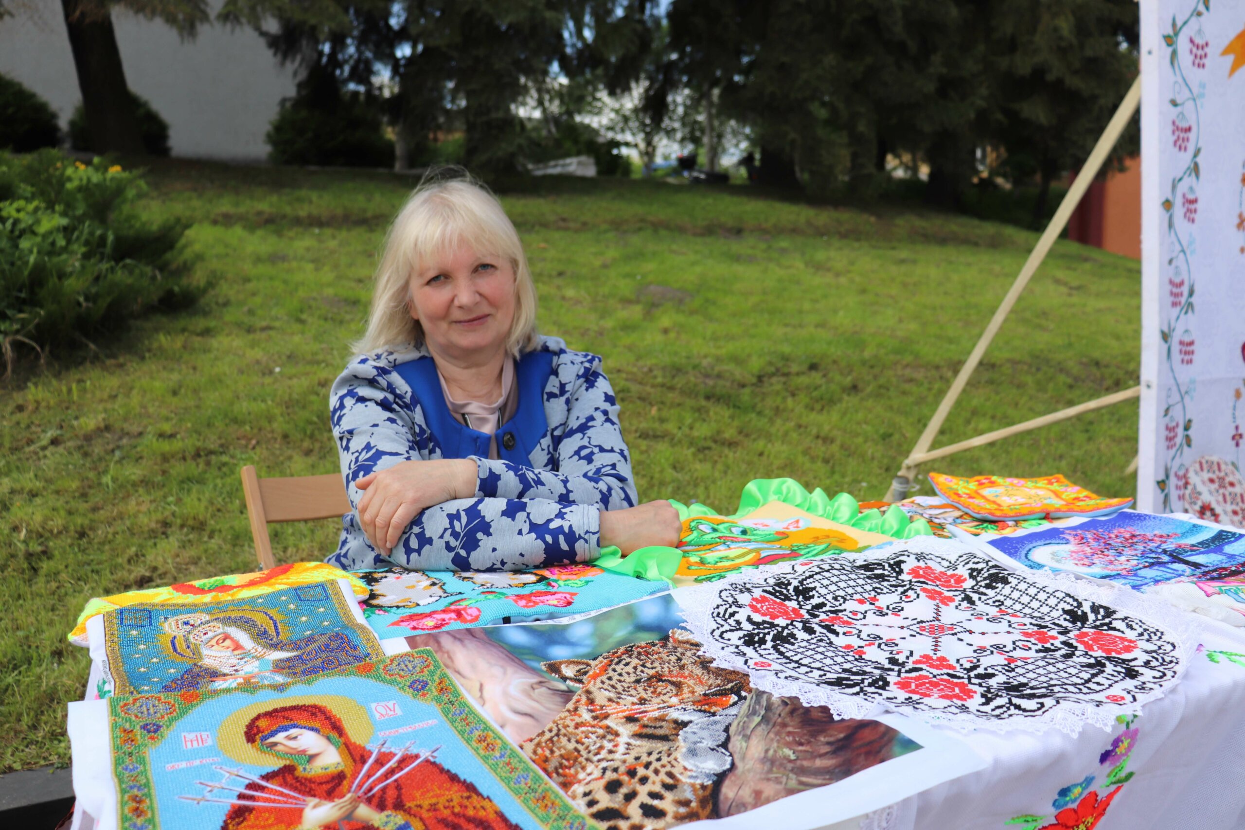 “Я вперше на такому дійстві. Я не з Острога, з Хорова. Насправді, вже дуже давно займають вишивкою, але більше стала вишивати після того, як вийшла на пенсію. Я дуже люблю це свято, бо дуже люблю вишивати. Вишиваю і вранці, і ввечері, коли маю вільний час. Навіть чоловік свариться, що завжди я маю роботу”, — ділиться враженнями 80-річна майстриня Віра.