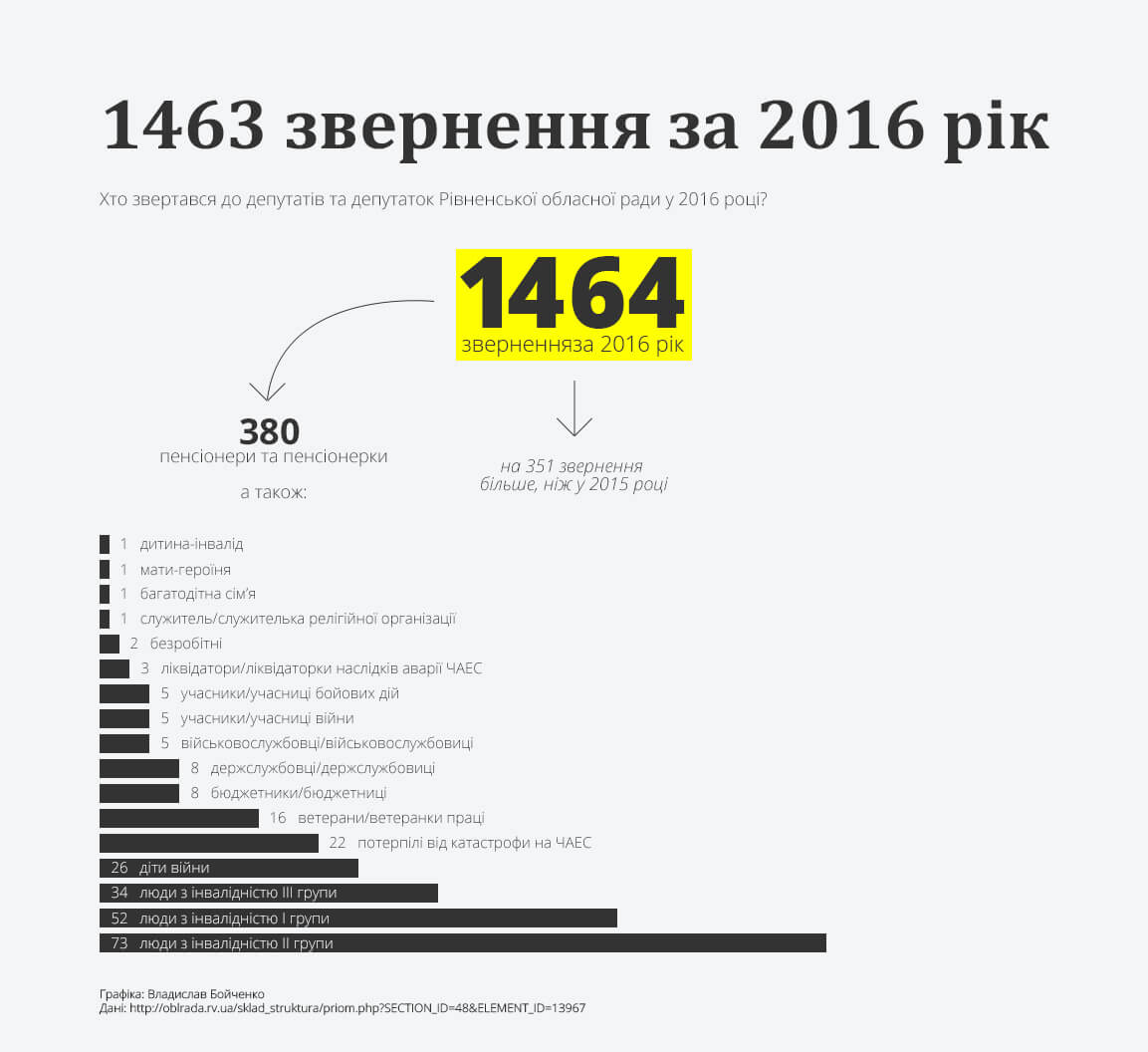 На жаль, ми не знайшли інформації щодо звернень у Острозькому районі за попередній рік. Тому публікуємо загальну картину Рівненщини, яка показує, хто звертався до депутатів та депутаток Рівненської облради у 2016.