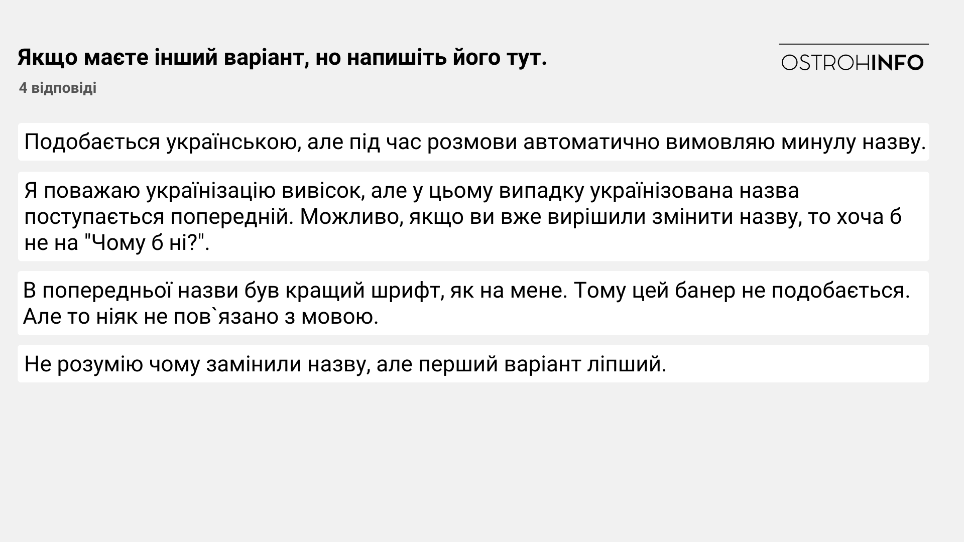 Ostroh.info провело опитування серед 100 відвідувачів і відвідувачок “Чому б ні?”, аби дізнатися, як вони ставляться до перейменування закладу.