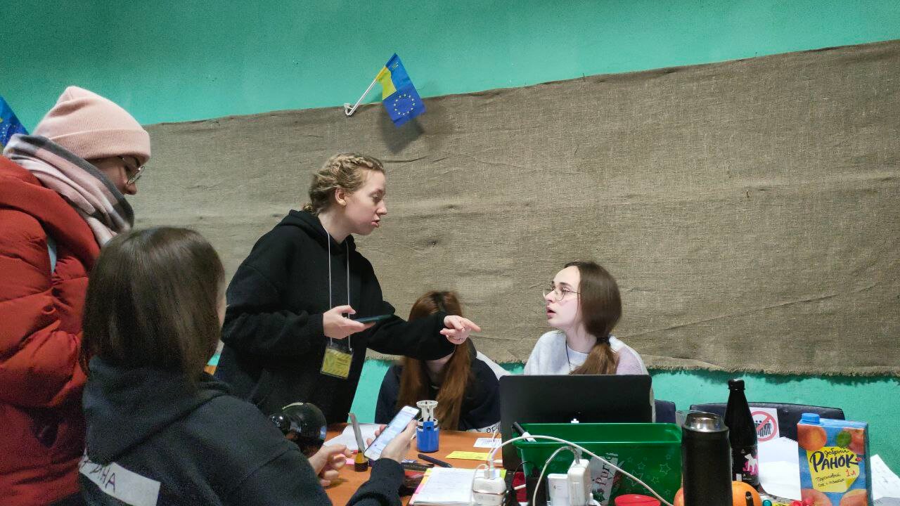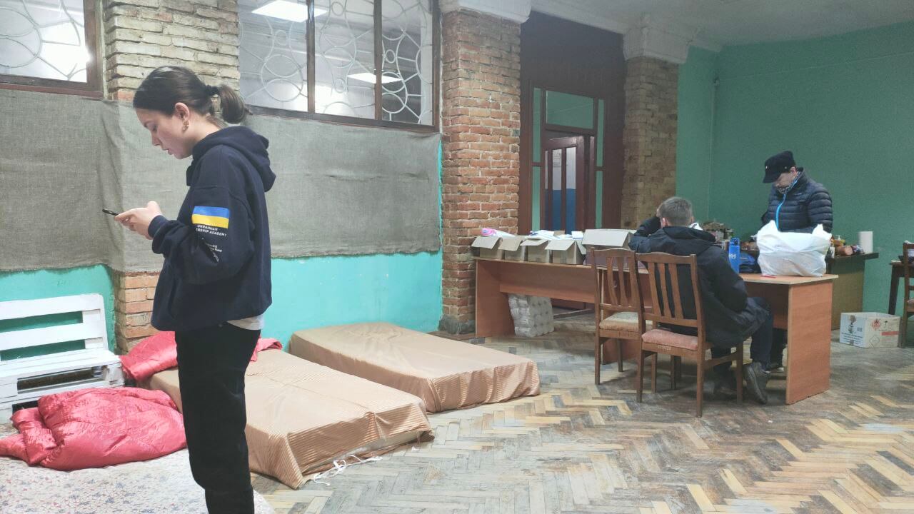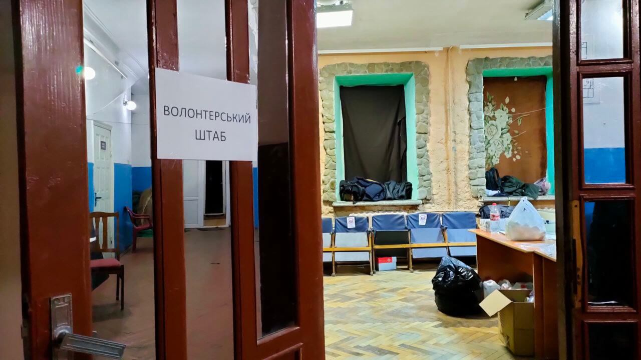 Олег Цимбалістий, голова ГО “Територія змін”, який опікується роботою штабу, проводить до неї (кімнатки), щоб показати велику репортерську камеру. За столом там сидять люди.