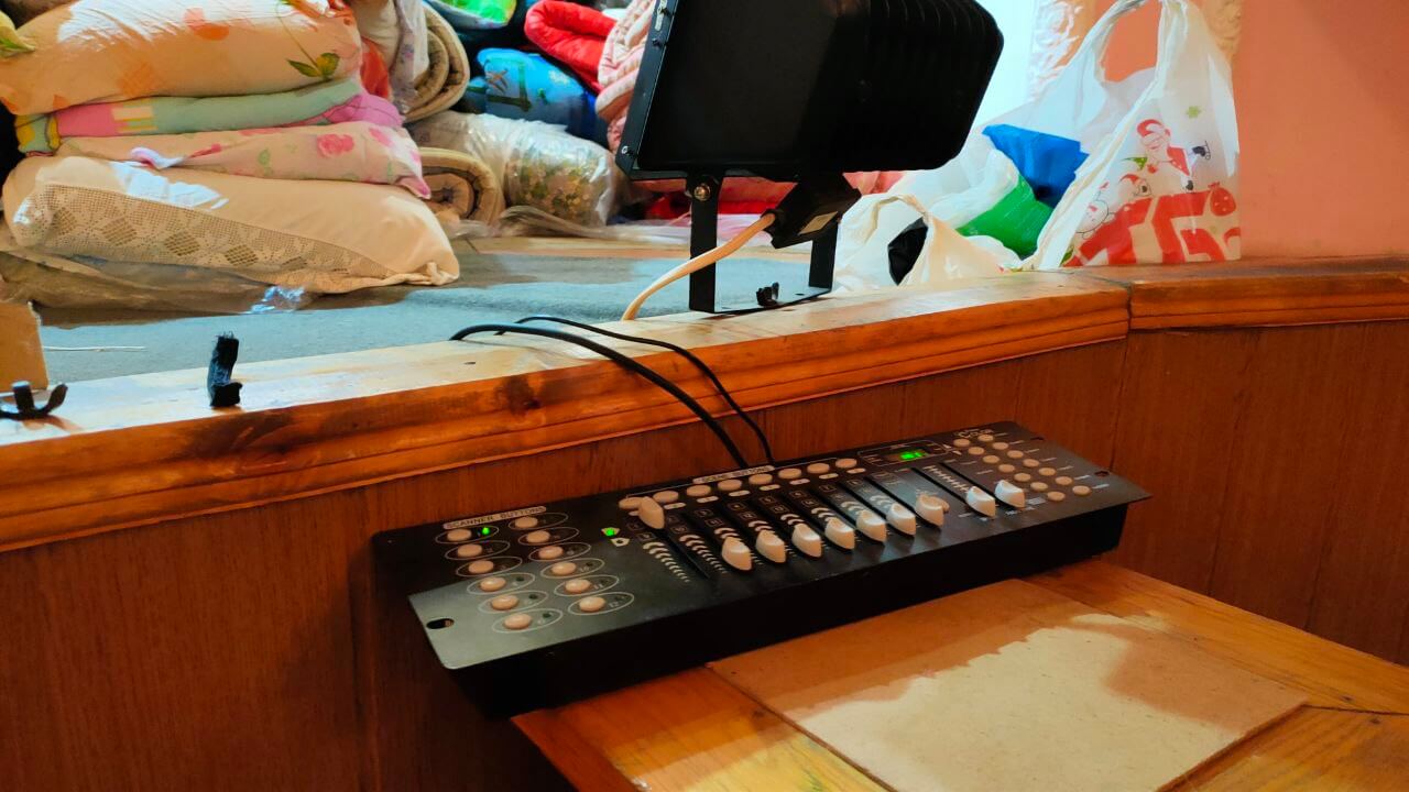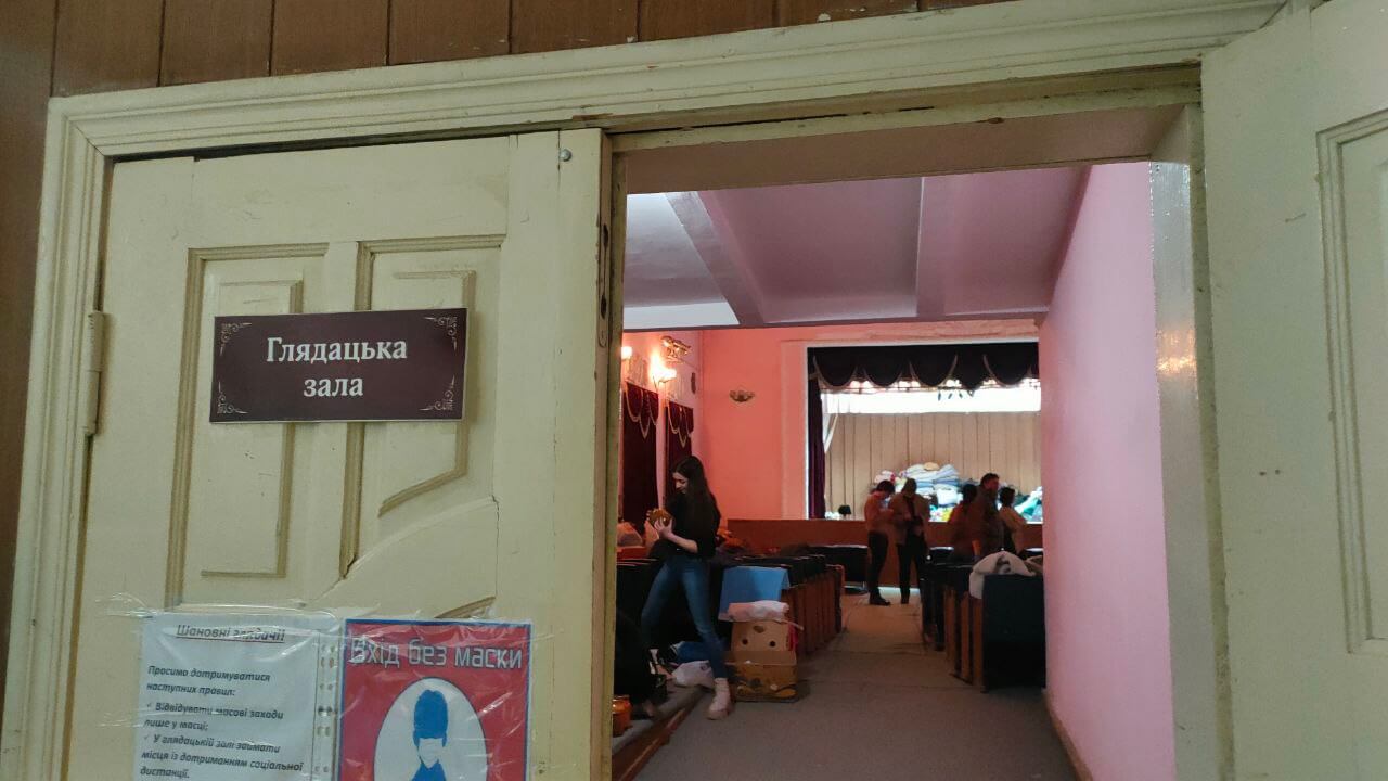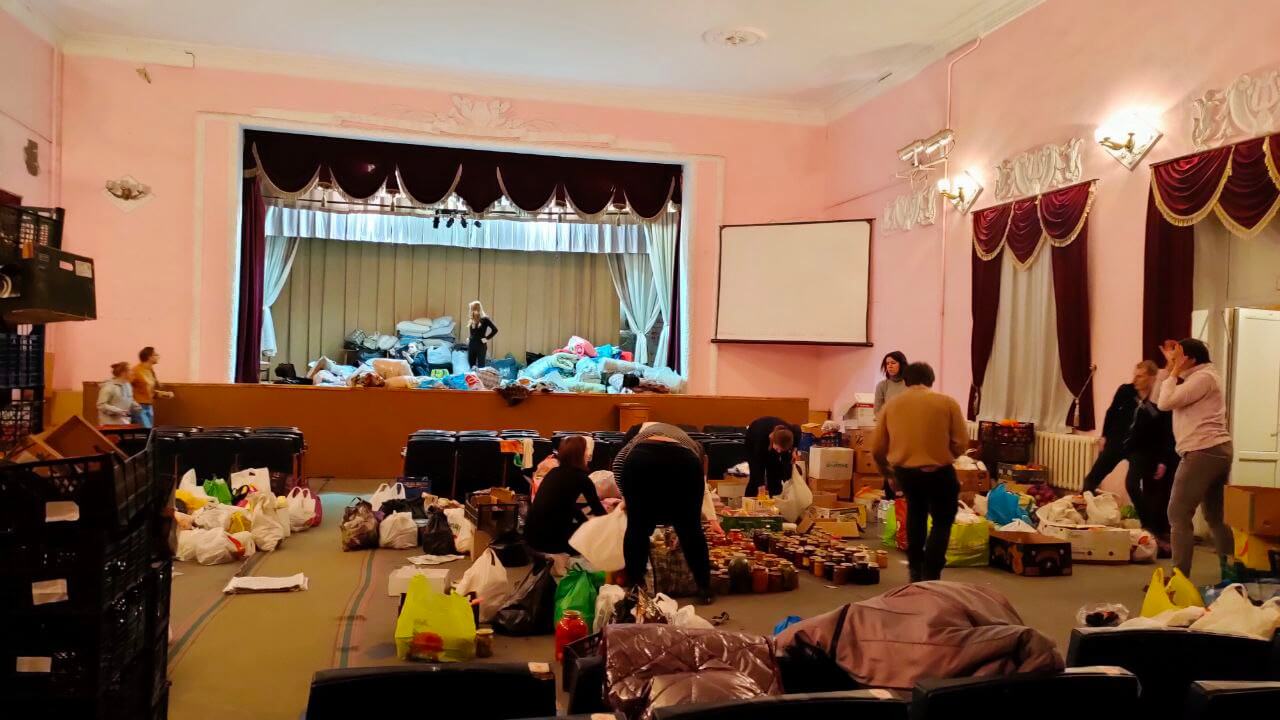 Проходимо до наступної кімнати. Це колишня глядацька зала. Але тепер тут нема стільців, а на сцені замість виступів дівчата сортують одежу та постіль. Там, де колись були глядачі — люди розбирають продукти, сортують, рахують, завантажують машини.