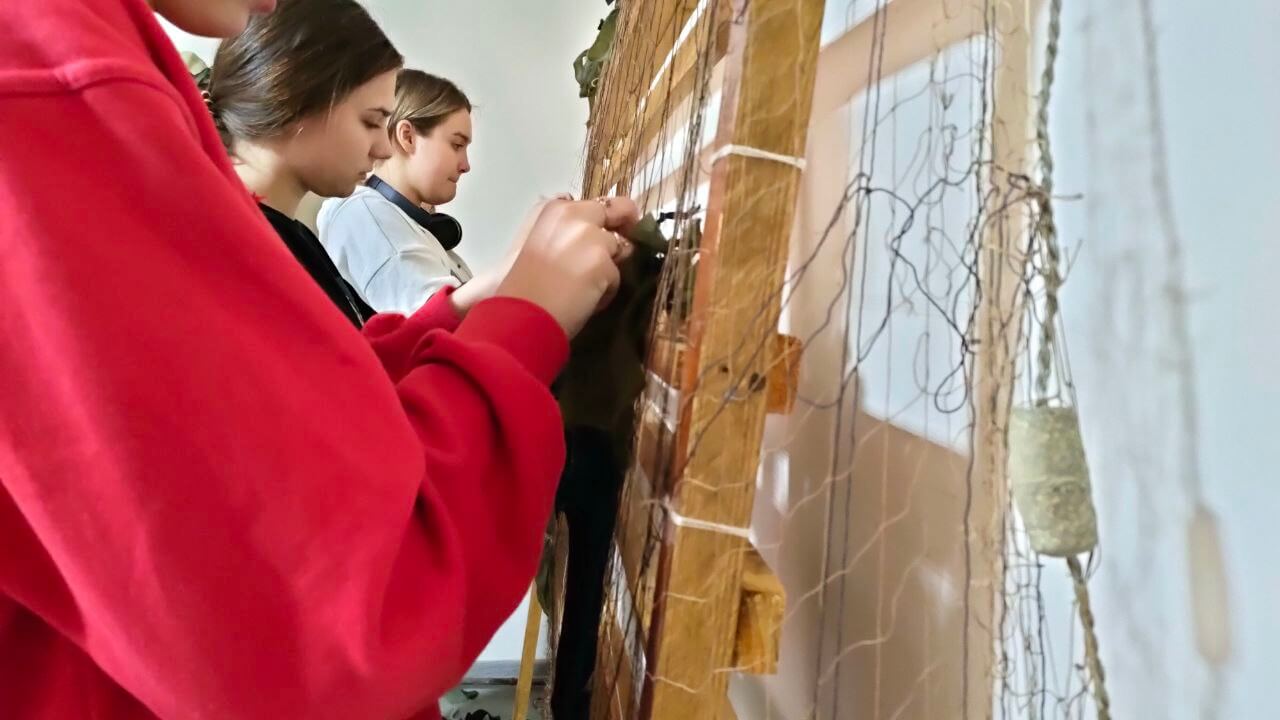 Наступного дня ще починають плести сітки. У маленькій кімнаті жінки нарізають тканину, говорять між собою. Дівчата, які трохи молодші, плетуть маскувальні сітки.