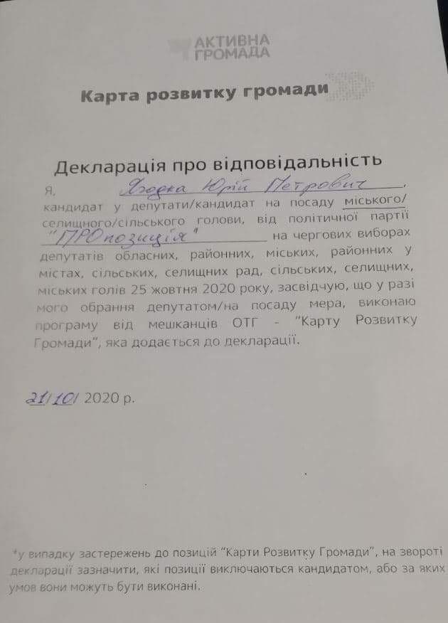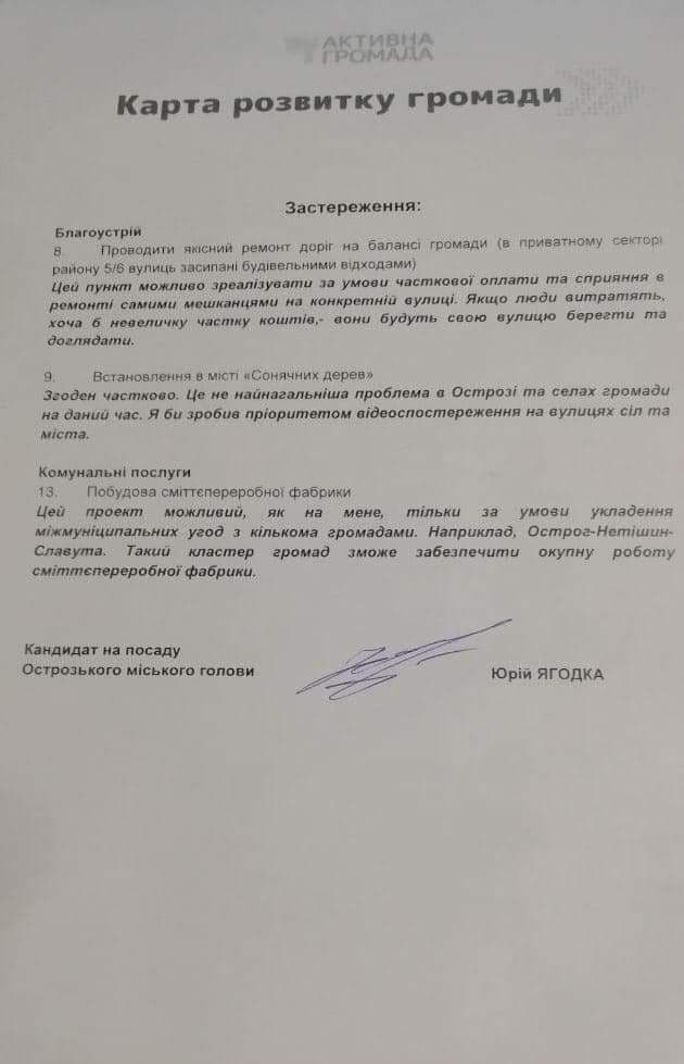Кандидатам на посаду голови Острозької ОТГ було запропоновано підписати Декларацію. Кандидат має право підписати не всі, а лише певні пункти. Новообраний голова Острозької ОТГ Юрій Ягодка також підписав план розвитку, але вніс поправки у пункти, з якими погоджується частково – про проведення у місті якісного ремонту доріг за баланс громад, встановлення сонячних дерев та побудову сміттєпереробної фабрики.