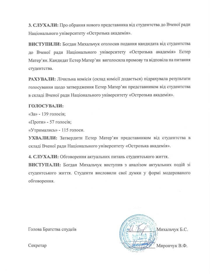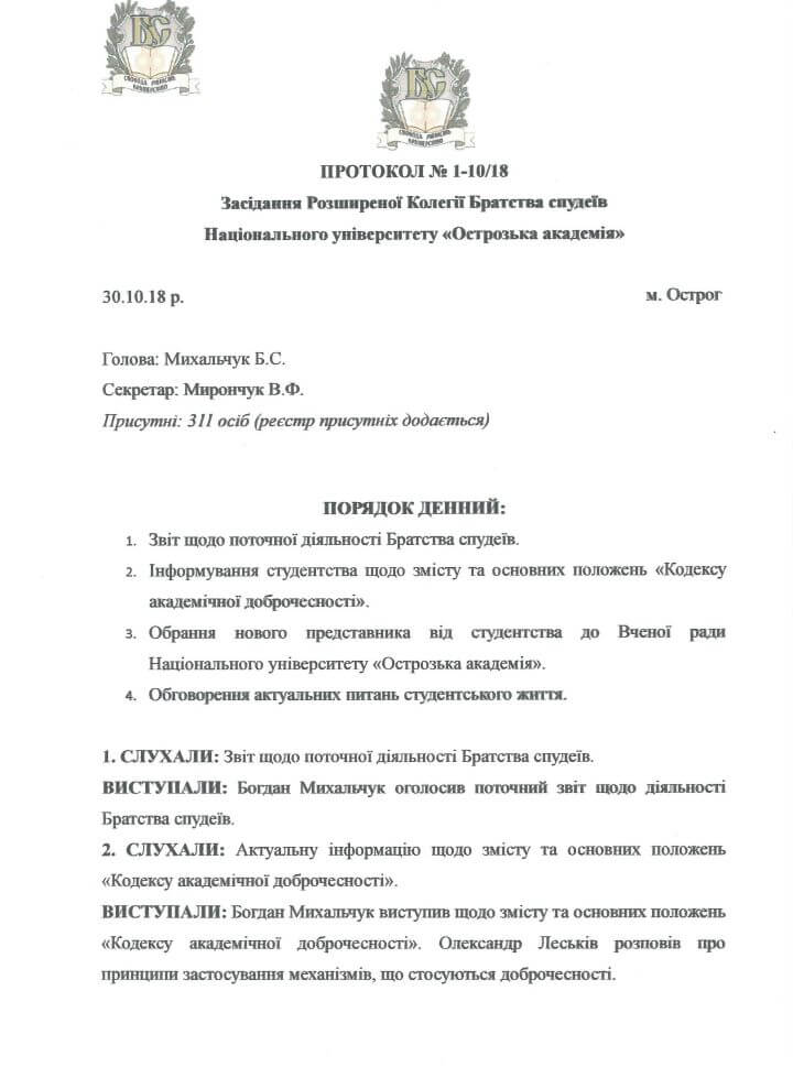«Інформація й документи, оприлюднені Дмитром, були вилучені без поставлення до відома решти членів Колегії Братства спудеїв. А так званий «протокол Розширеної колегії» – чернетка (якби Дмитро зробив двосторонню копію, ви б у цьому переконалися), адже на Розширеній колегії не розглядали питання про її скасування і перехід до створення Парламенту, а вирішували питання про обрання представника на вчену раду», – пояснив ГБС.