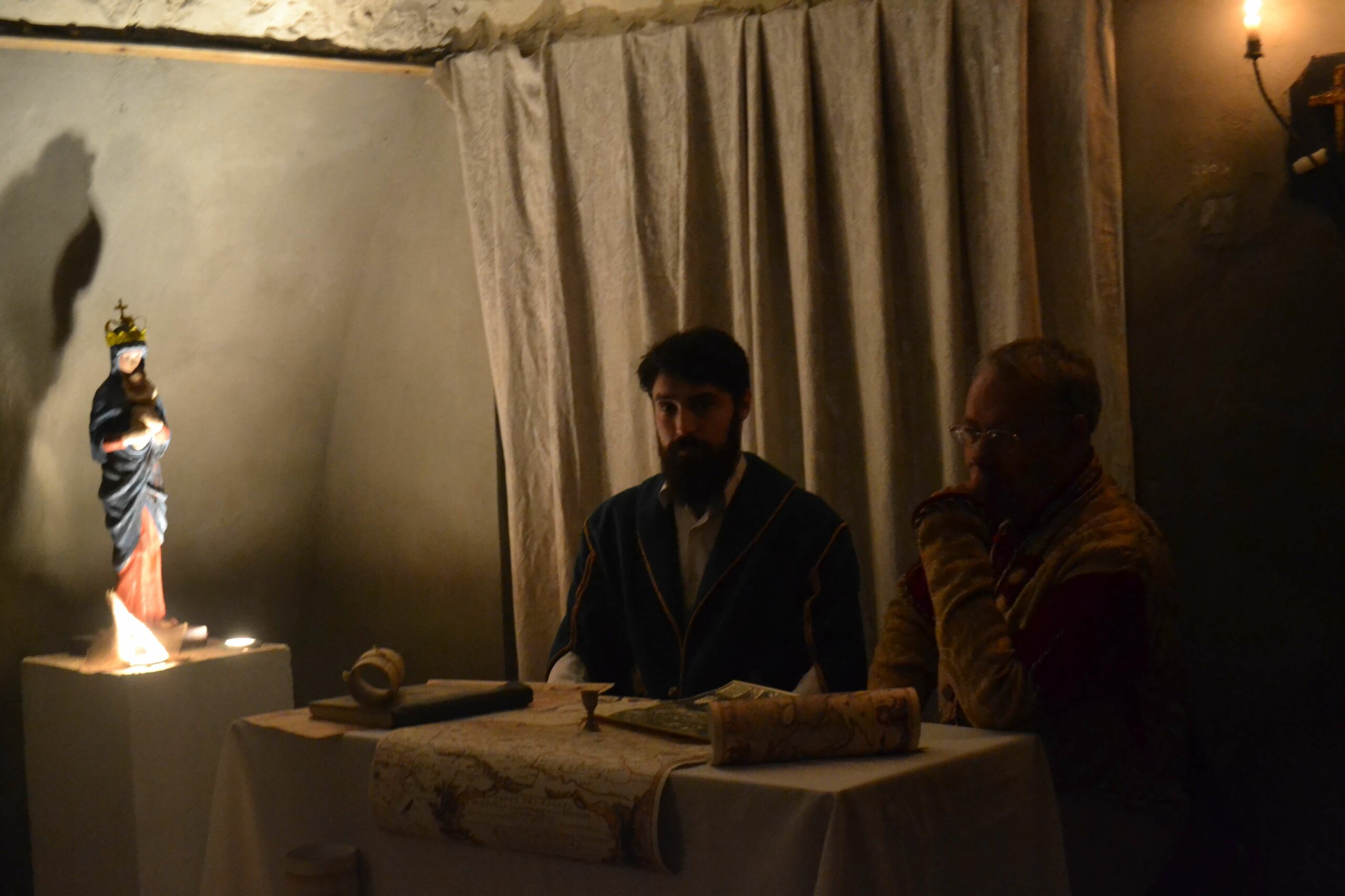 Далі, йдучи в підземелля, гості чують суперечку князя Януша Сангушко та архітектора Паоло Фонтана. У 18 столітті, князь подарував монахам-капуцинам ділянку землі, де ті вирішили збудувати святиню. Проте він не врахував того, що під цієї землею тече річка, яка заважає будівництву (яка створює проблеми й досі). Вирішувати цю проблему довелося італійському митцю Паоло Фонтану.