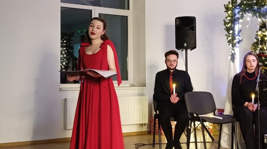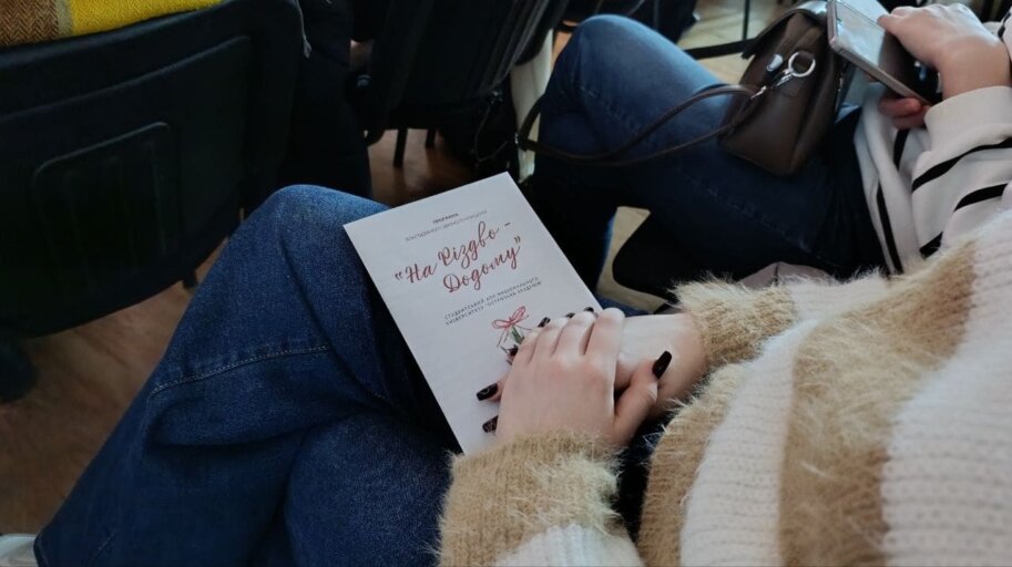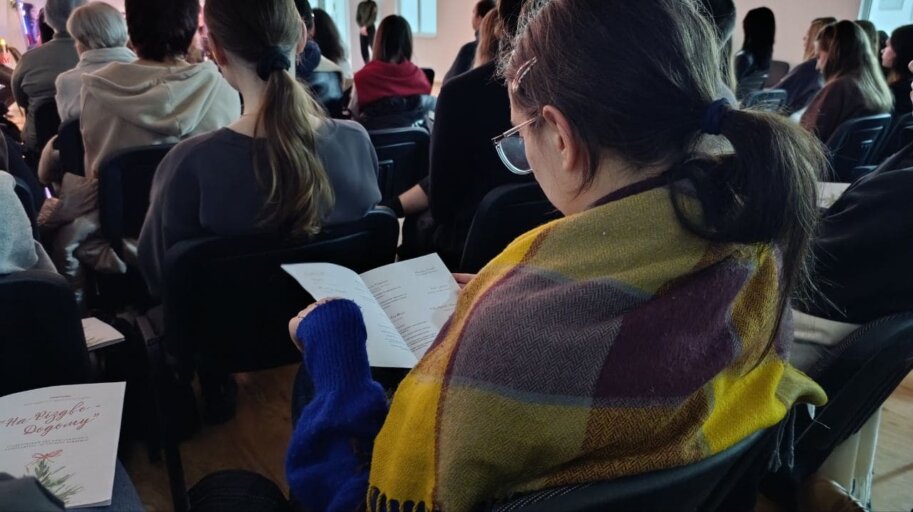 Кожного, хто поспішав на захід, зустрічали біля входу — тут роздавали програми концерту з посиланням на благодійну банку. Поки глядачі чекали на перші ноти співу, авдиторію освітлювали вогники гірлянд на ялинці та декораціях, що навіювали передчуття різдвяних див. У залі було чути дитячі голоси, розмови друзів, студентів та дорослих.