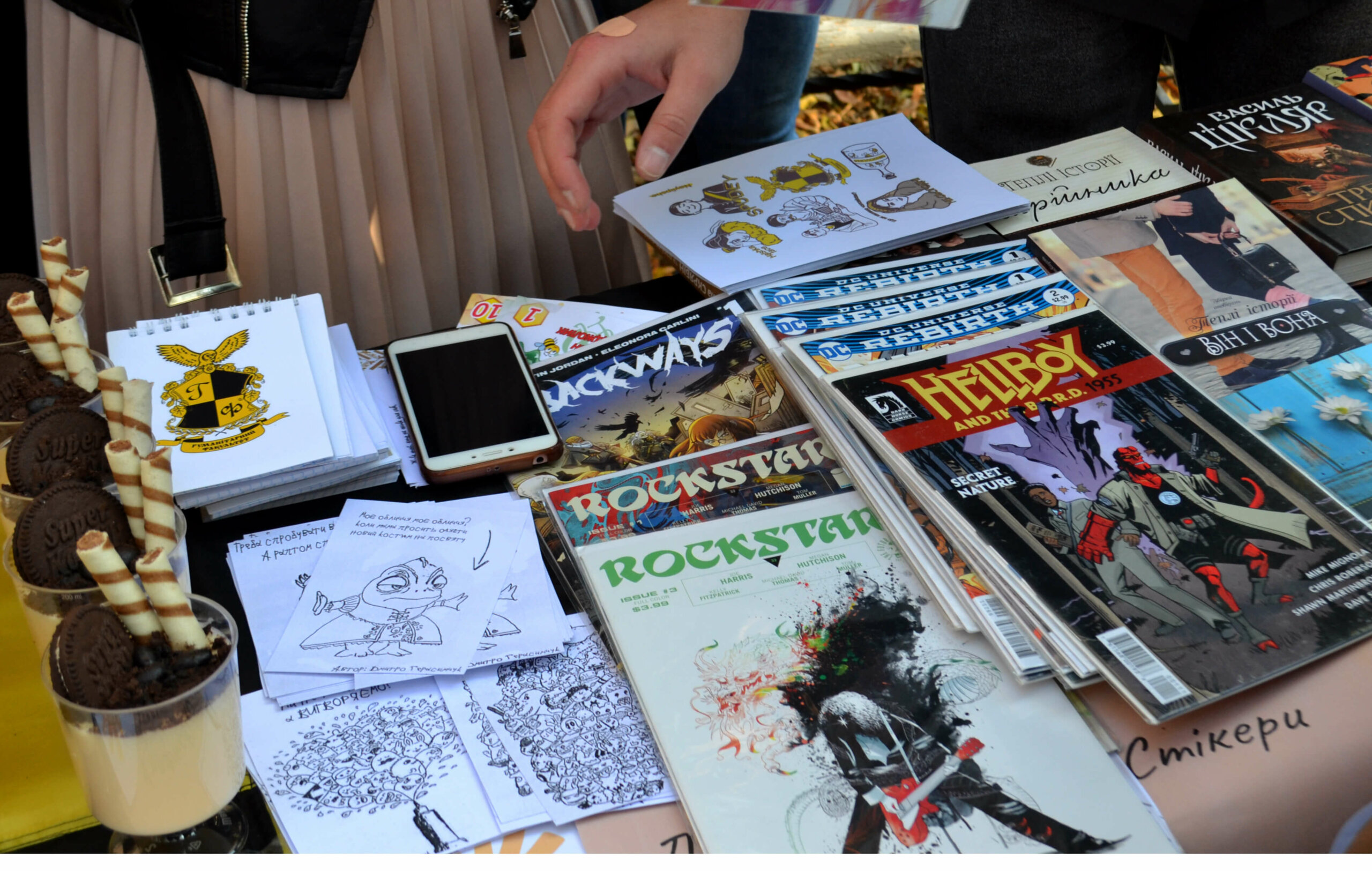 Випічка на ярмарку переважно домашнього приготування. Лише де-не-де можна було побачити магазинні печиво та тістечка. Продавали футболки з логотипом академії, подарункові набори, книги, комікси, кружки.