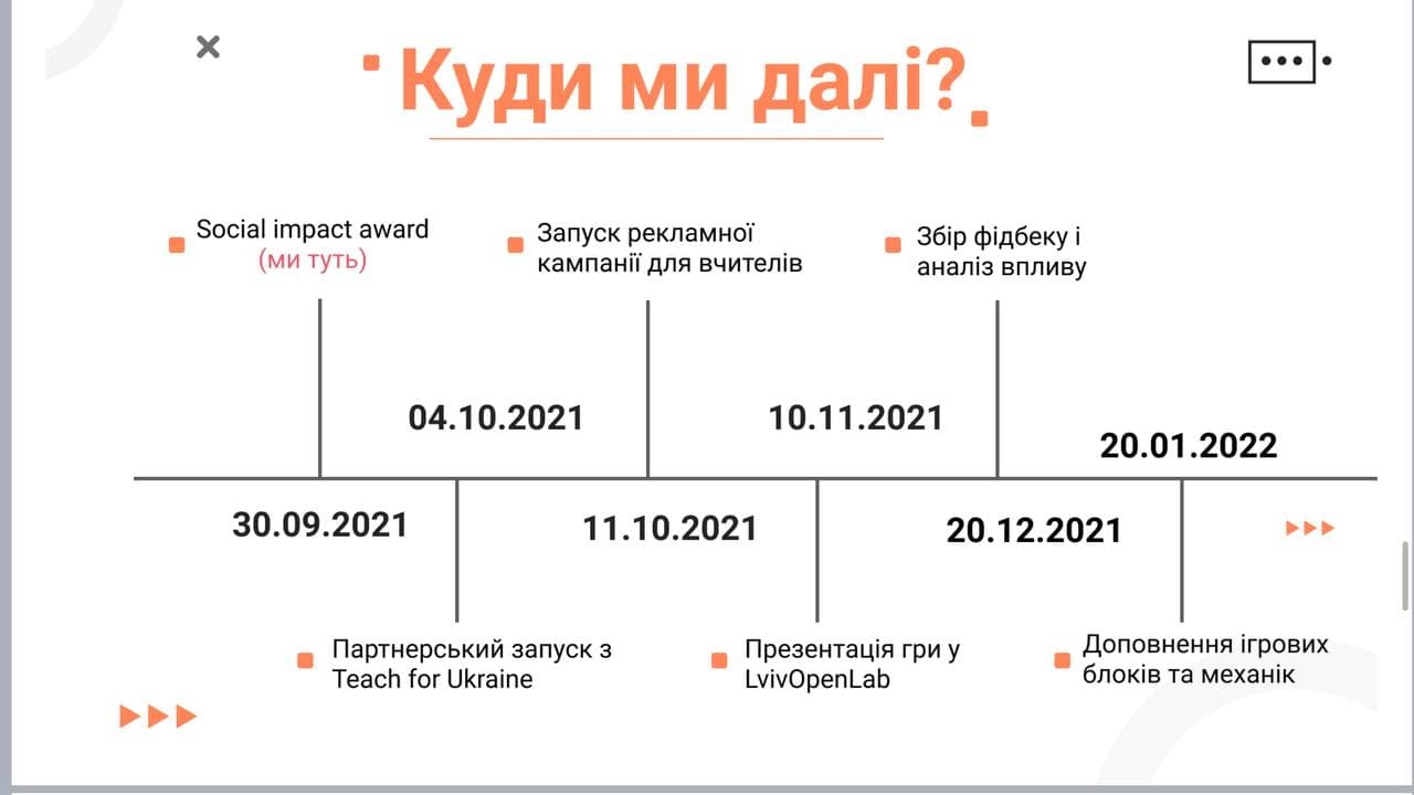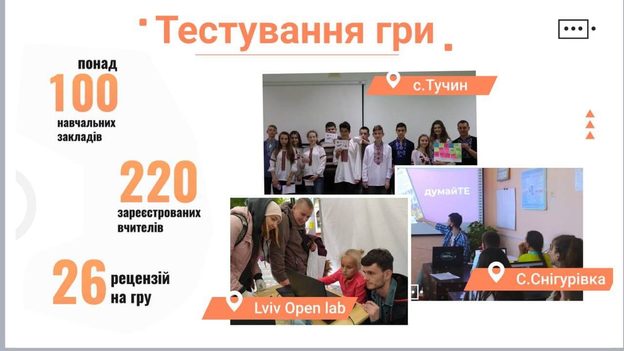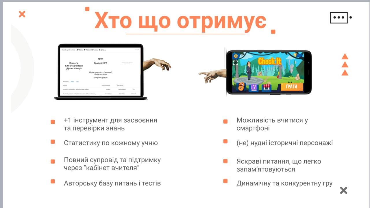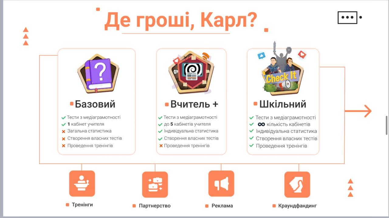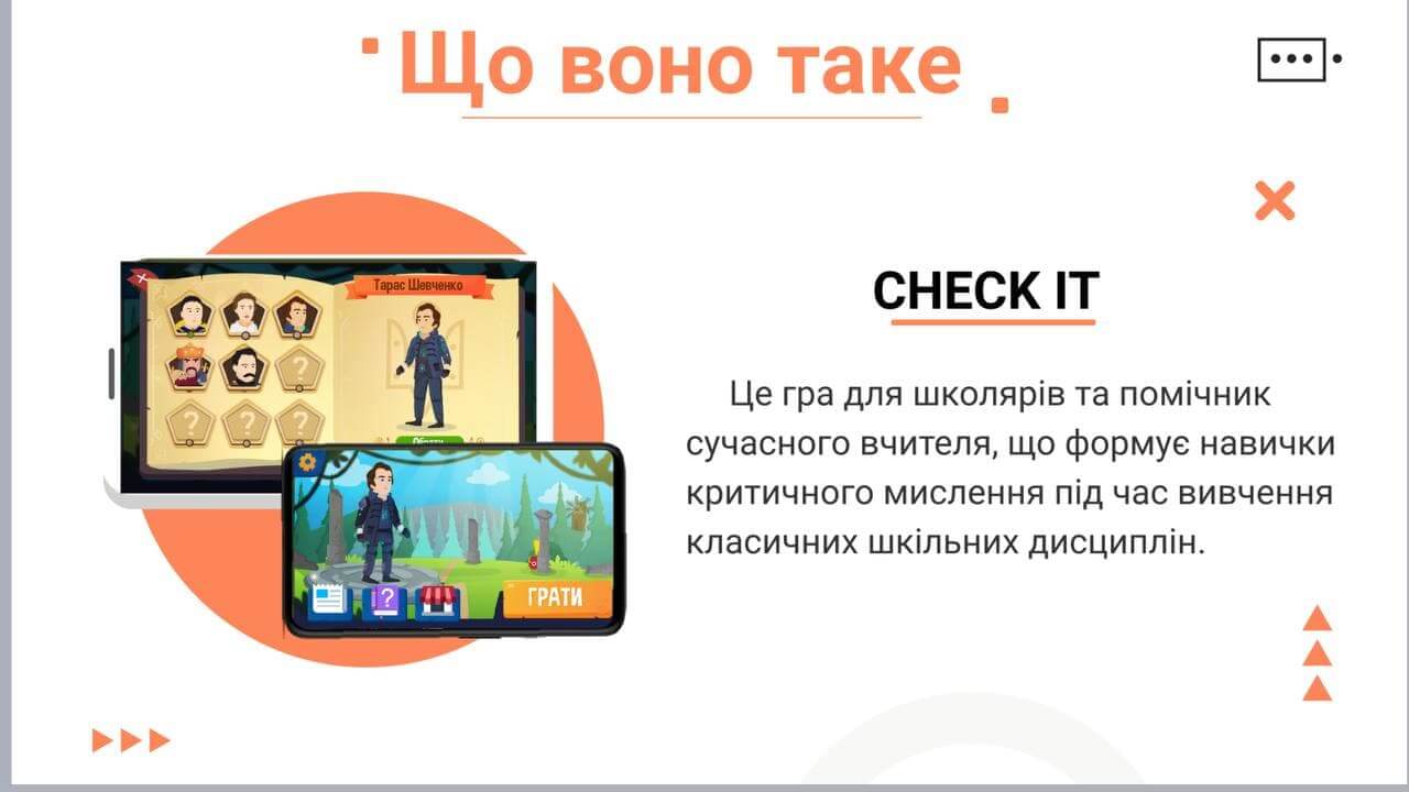 Команда острозьких студентів представляла свій проєкт — гру з медіаграмотності “Check It”. Це користувацька гра, яка вчить розвінчувати фейки. Проста форма, елементи конкуренції разом із корисною інформацію роблять її доступною та цікавою для дітей шкільного та підліткового віку. У грі змагаються 2 команди, які шукають правильні відповіді на запитання серед фейків.