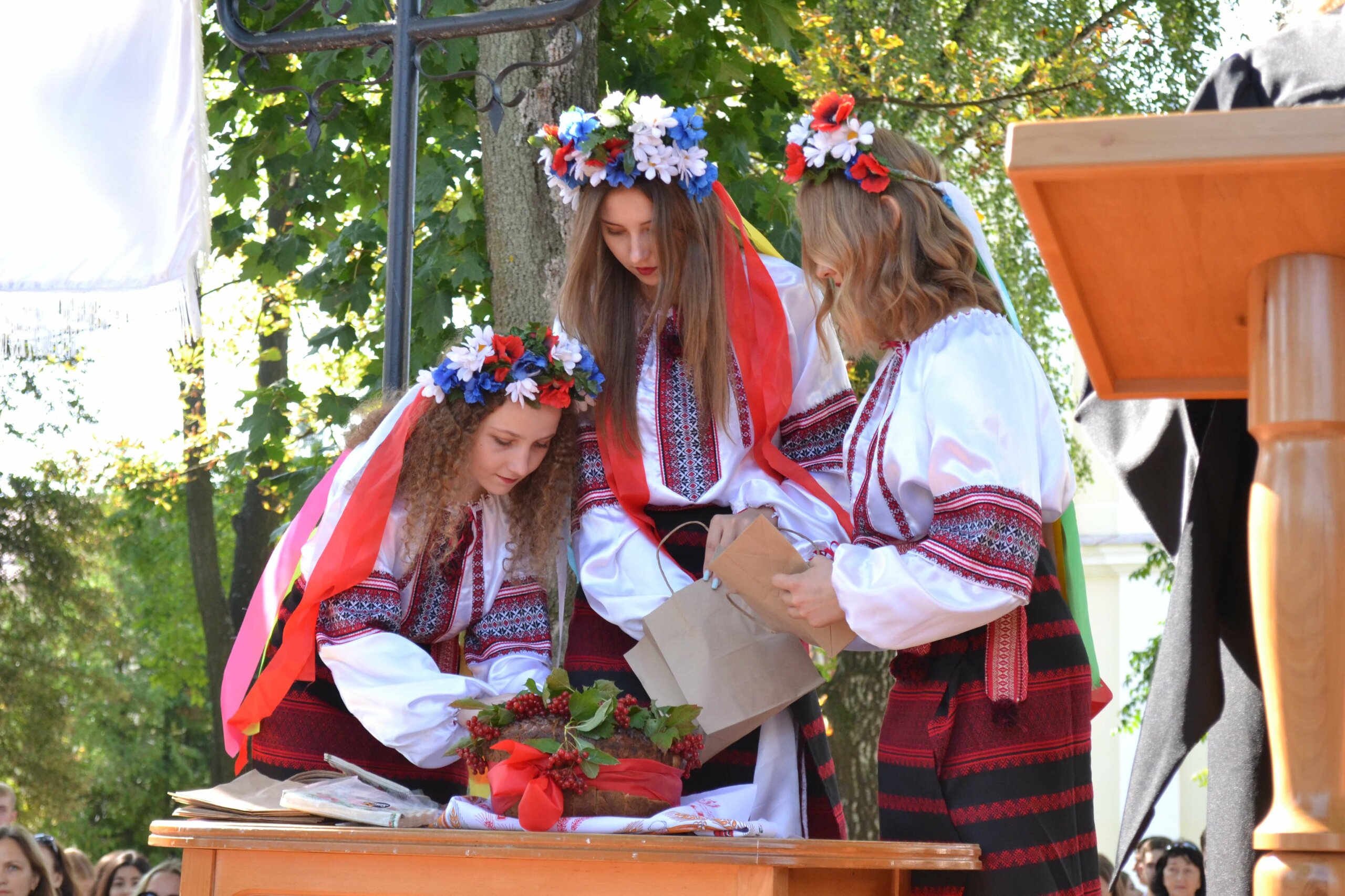 Дівчата у вишиванках частують гостей короваєм, запрошуючи їх до вітального слова.