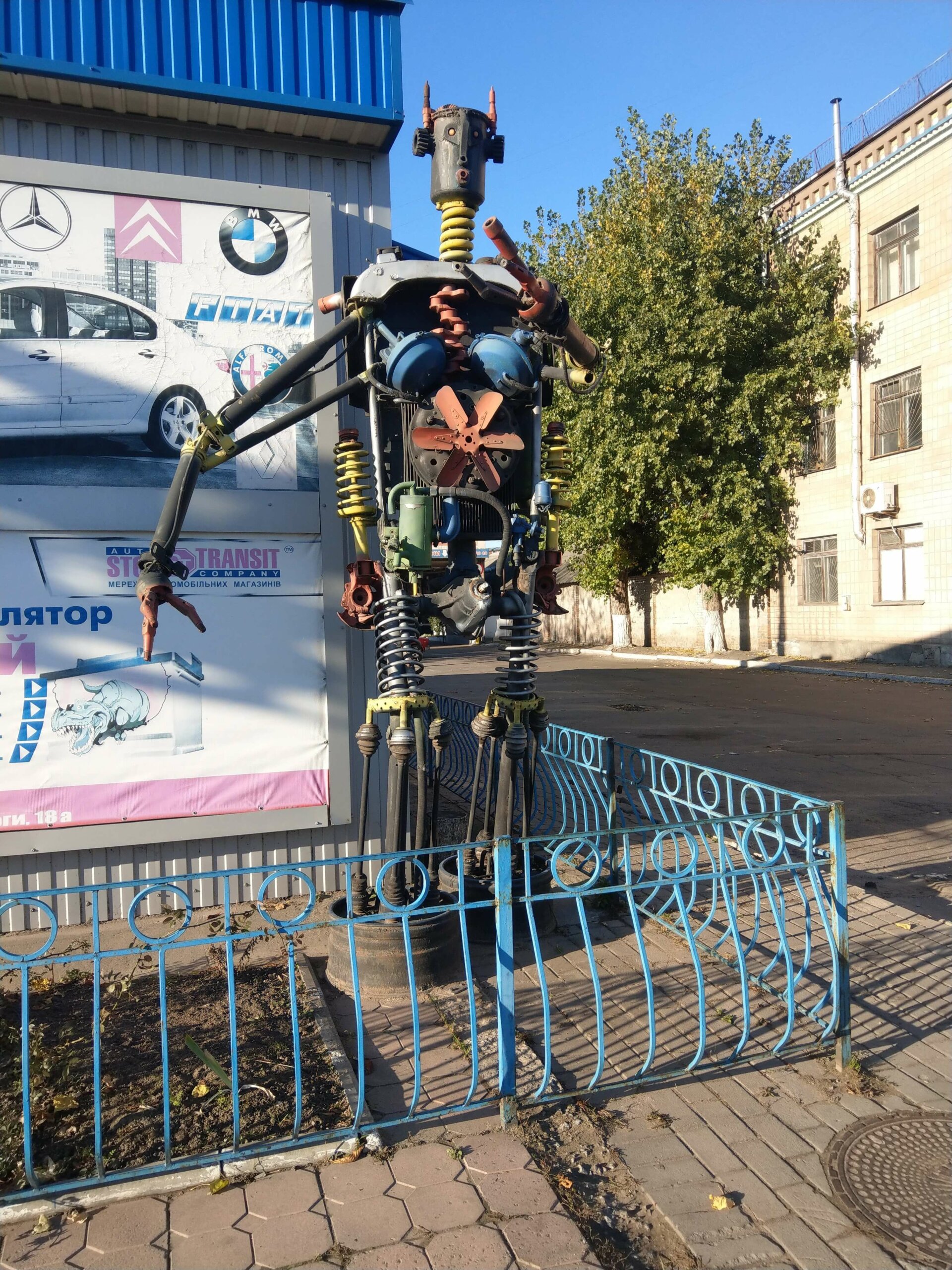 5:20, наша «карета» рушила. За 50 хвилин ми з Луцька дісталися до Рівного, далі їхати залишалося ще приблизно 3 години. Коли ми проїжджали саме місто, Таня на якомусь СТО зауважила цікаву скульптуру з металобрухту, куди ми і попрямували, щойно зійшли.