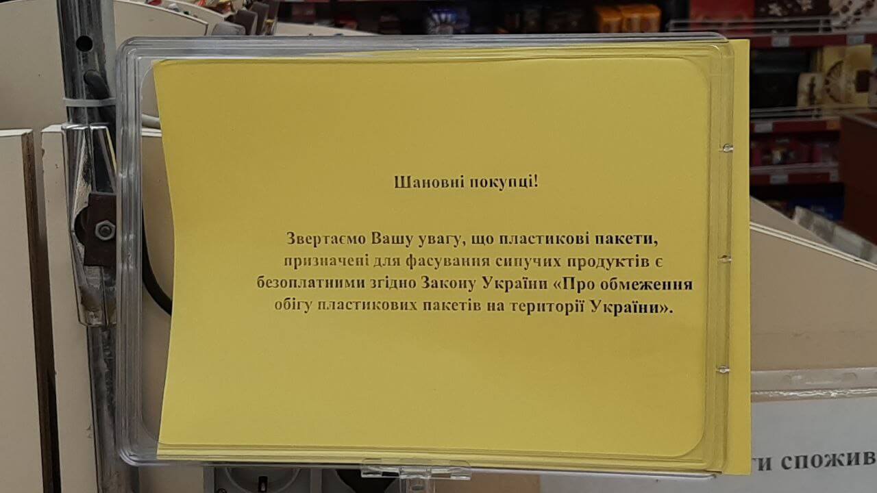Від 10 грудня 2021 року набрав чинності закон, який обмежує використання пластикових пакетів в Україні. Зі сфери торгівлі вони зникатимуть поступово: від обмеження безплатного розповсюдження пакетів до їх повної заборони.
