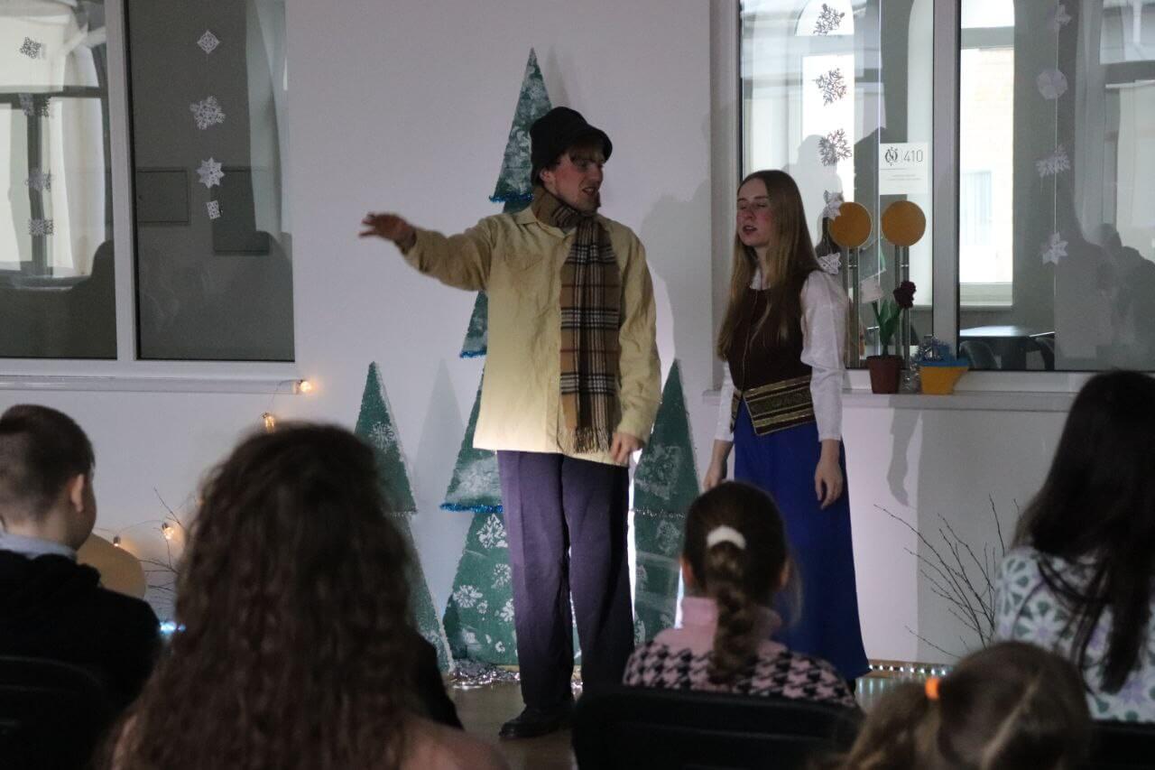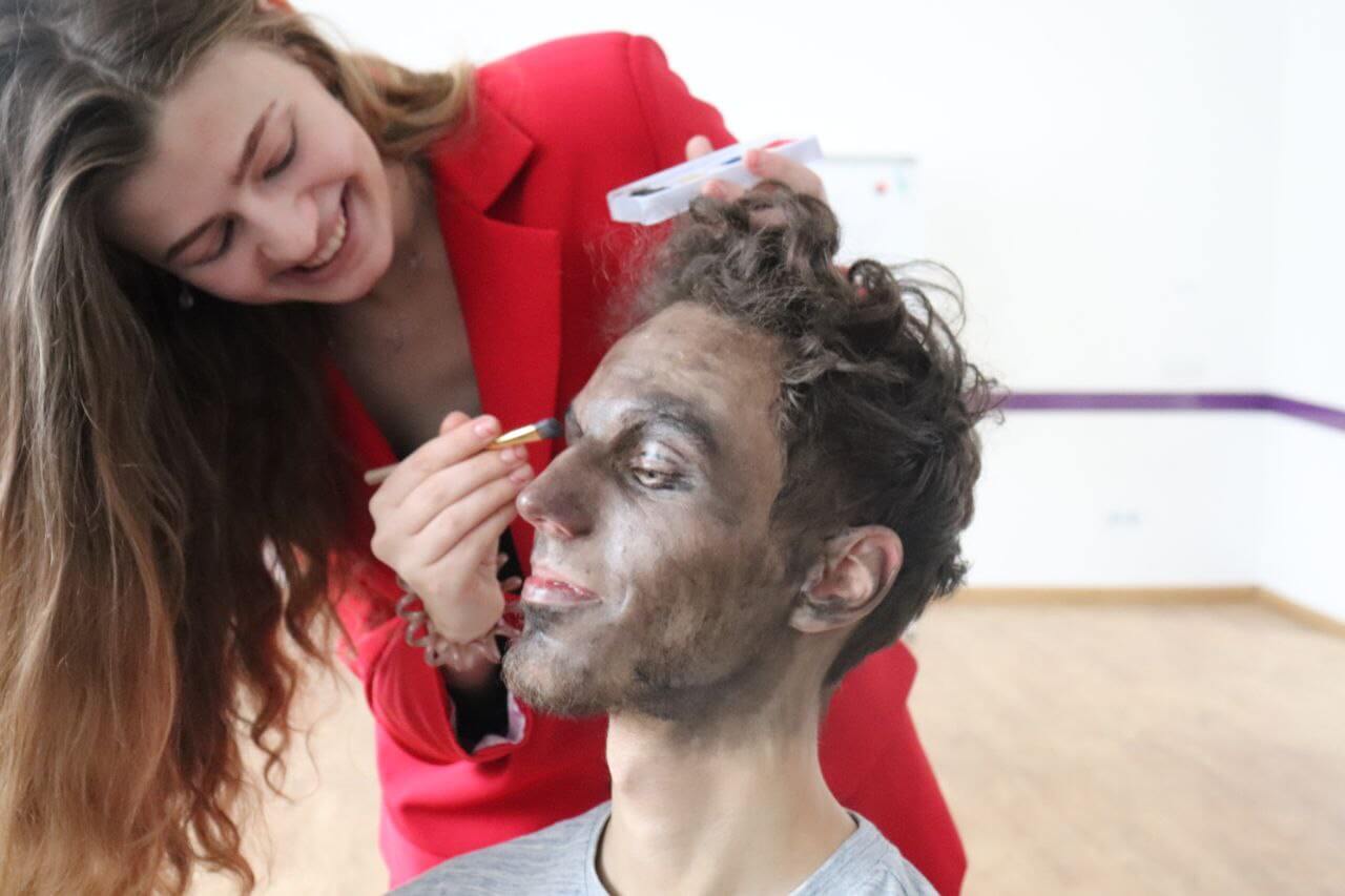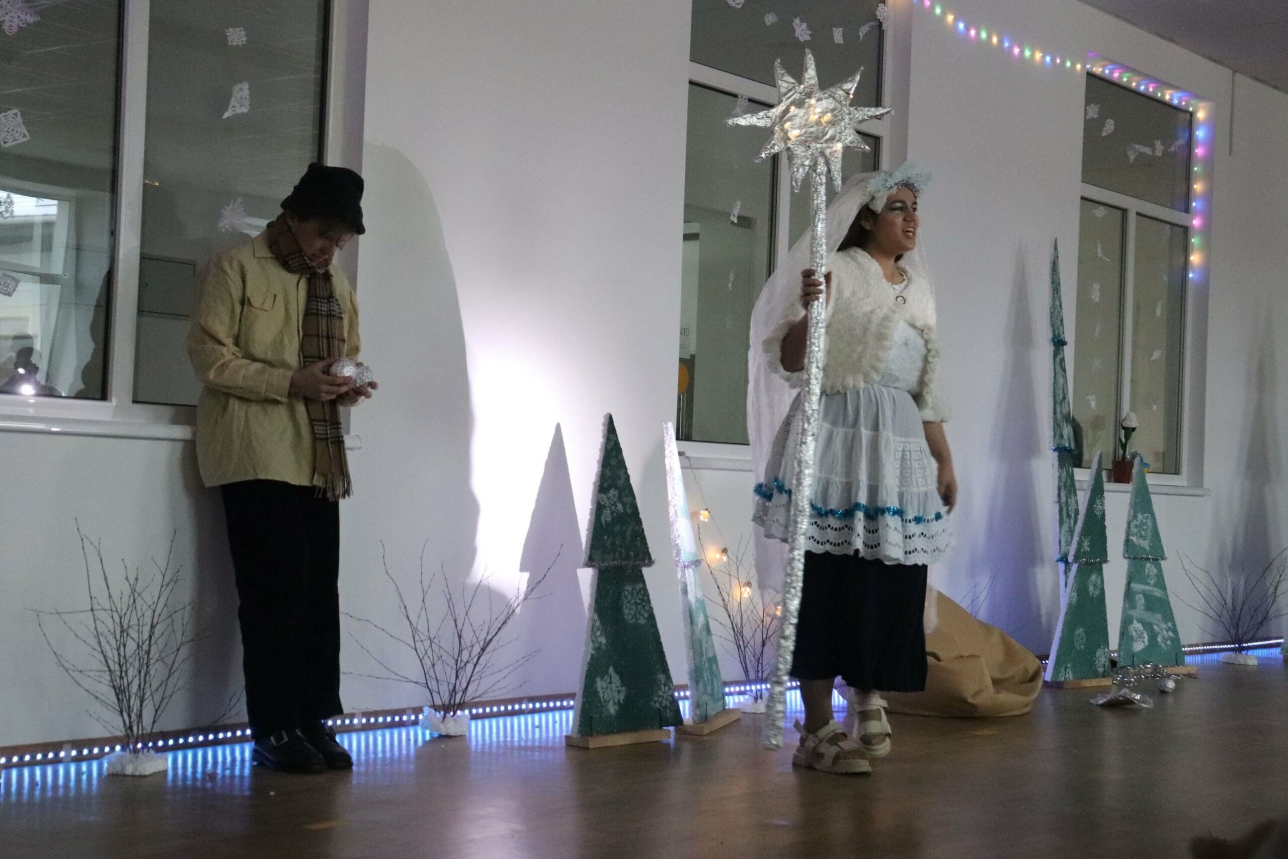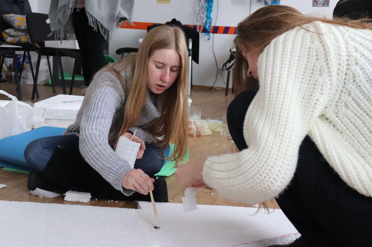 Тим часом в одній з аудиторій академії волонтери-актори вже поправляють свої костюми, кріплять пінопластові ялинки на дерев’яні дощечки, перевіряють грим одне одного — тривають останні приготування до вистави.