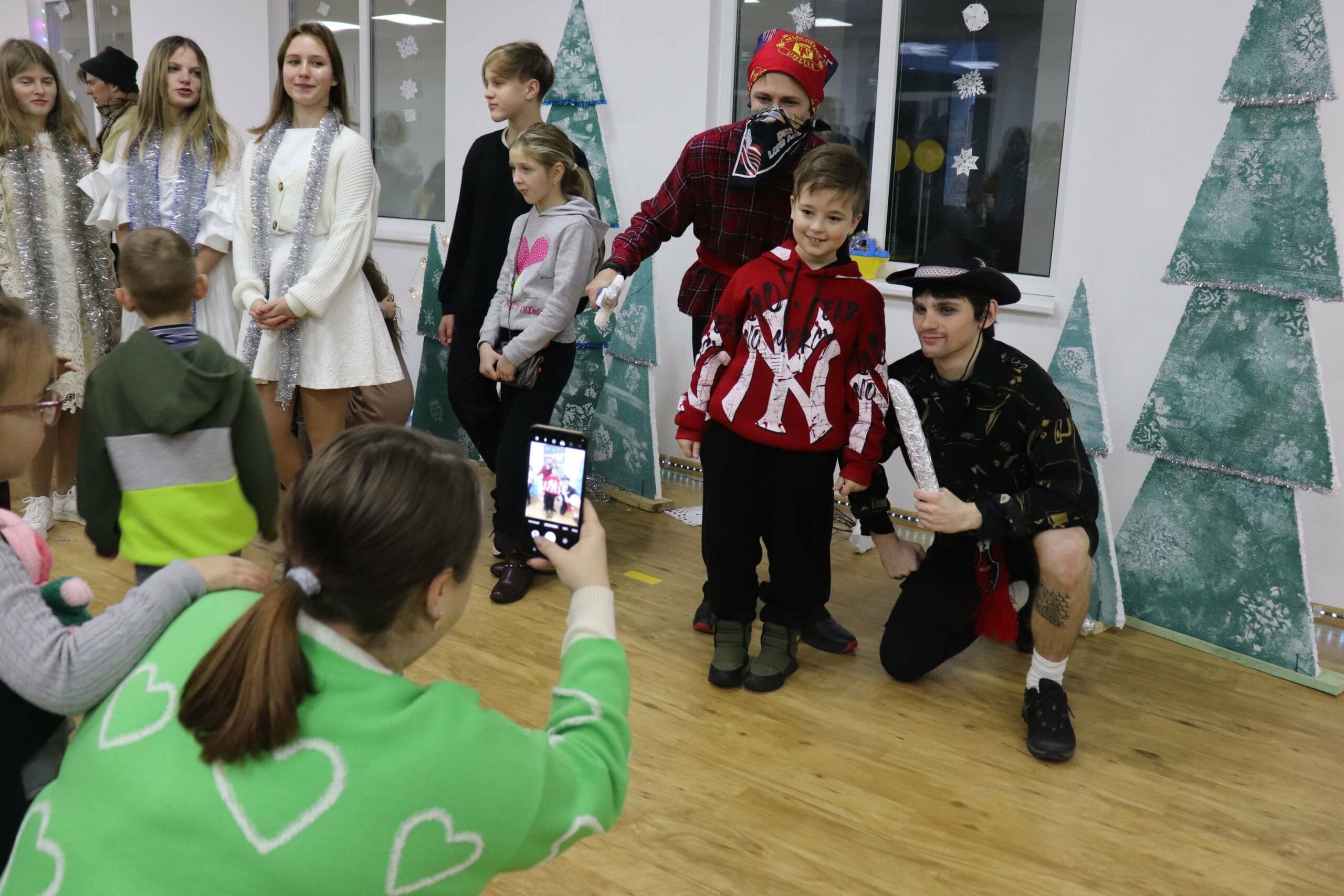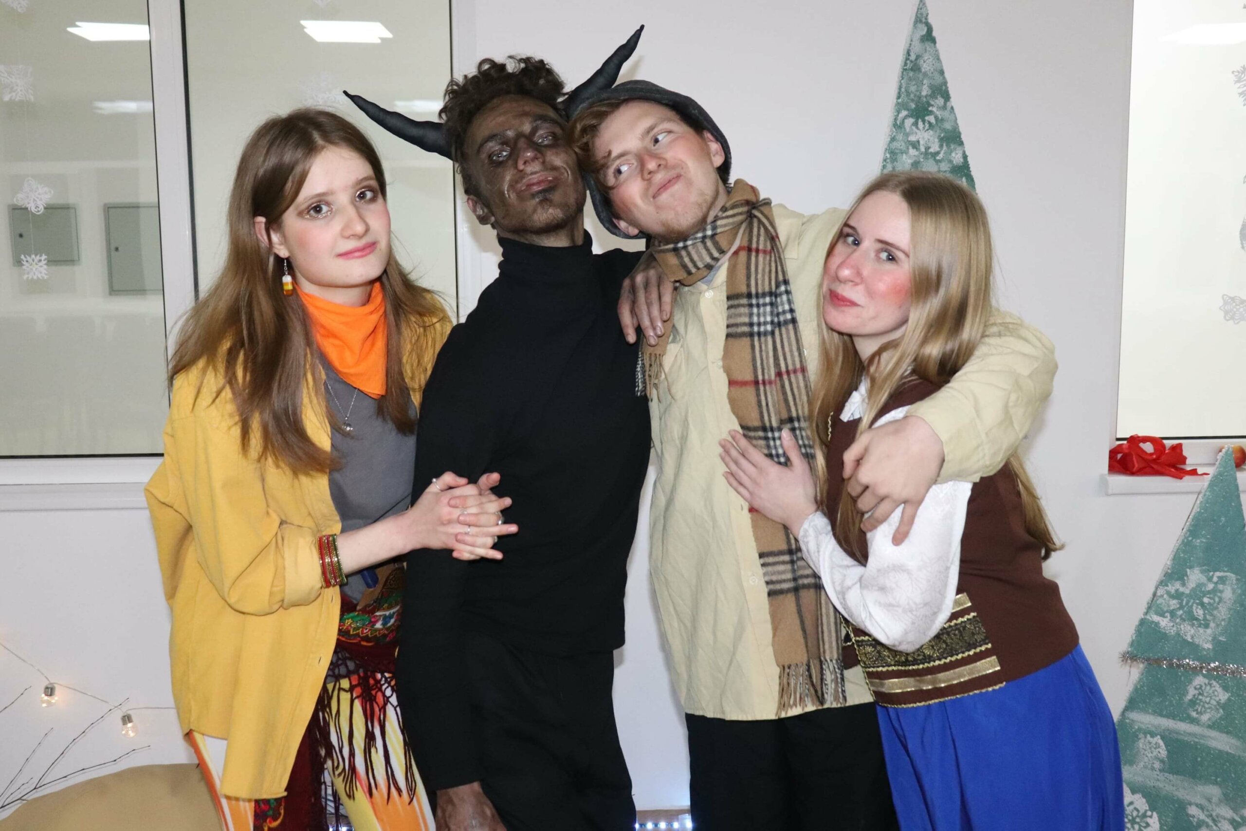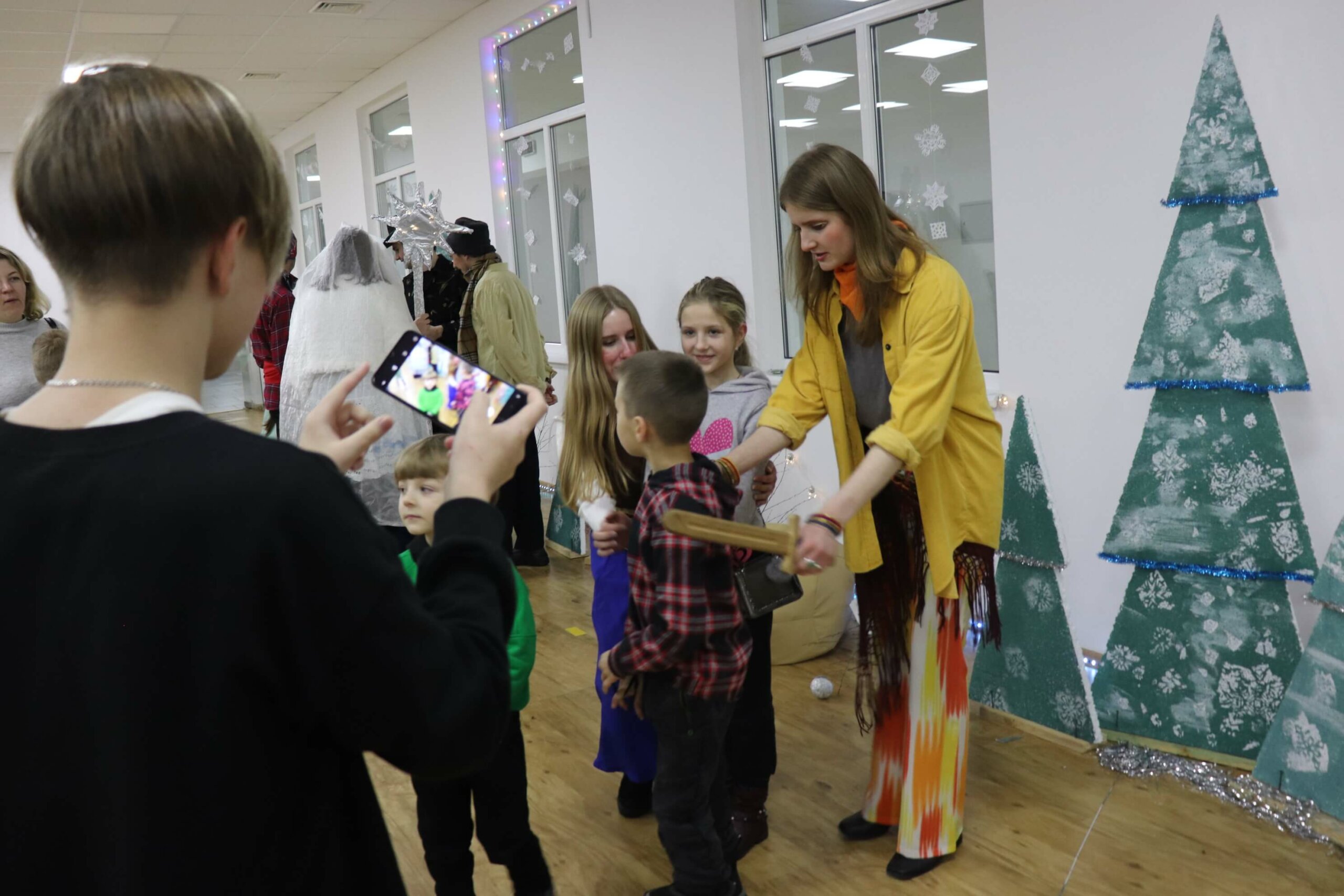 Тим часом в одній з аудиторій академії волонтери-актори вже поправляють свої костюми, кріплять пінопластові ялинки на дерев’яні дощечки, перевіряють грим одне одного — тривають останні приготування до вистави.
