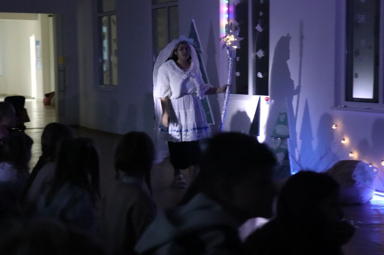Після цього усі рвучко схоплюються з місць і починають повторювати за сніжинками різдвяний танець. Діти доповнювали сюжет вистави: кричали розбійникам, що варто відпустити Герду, а згодом дали прочуханки королеві, назвавши її злою.
