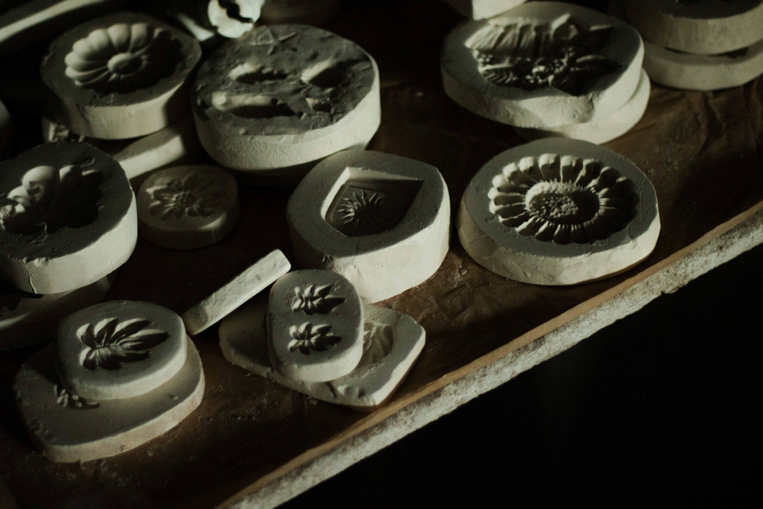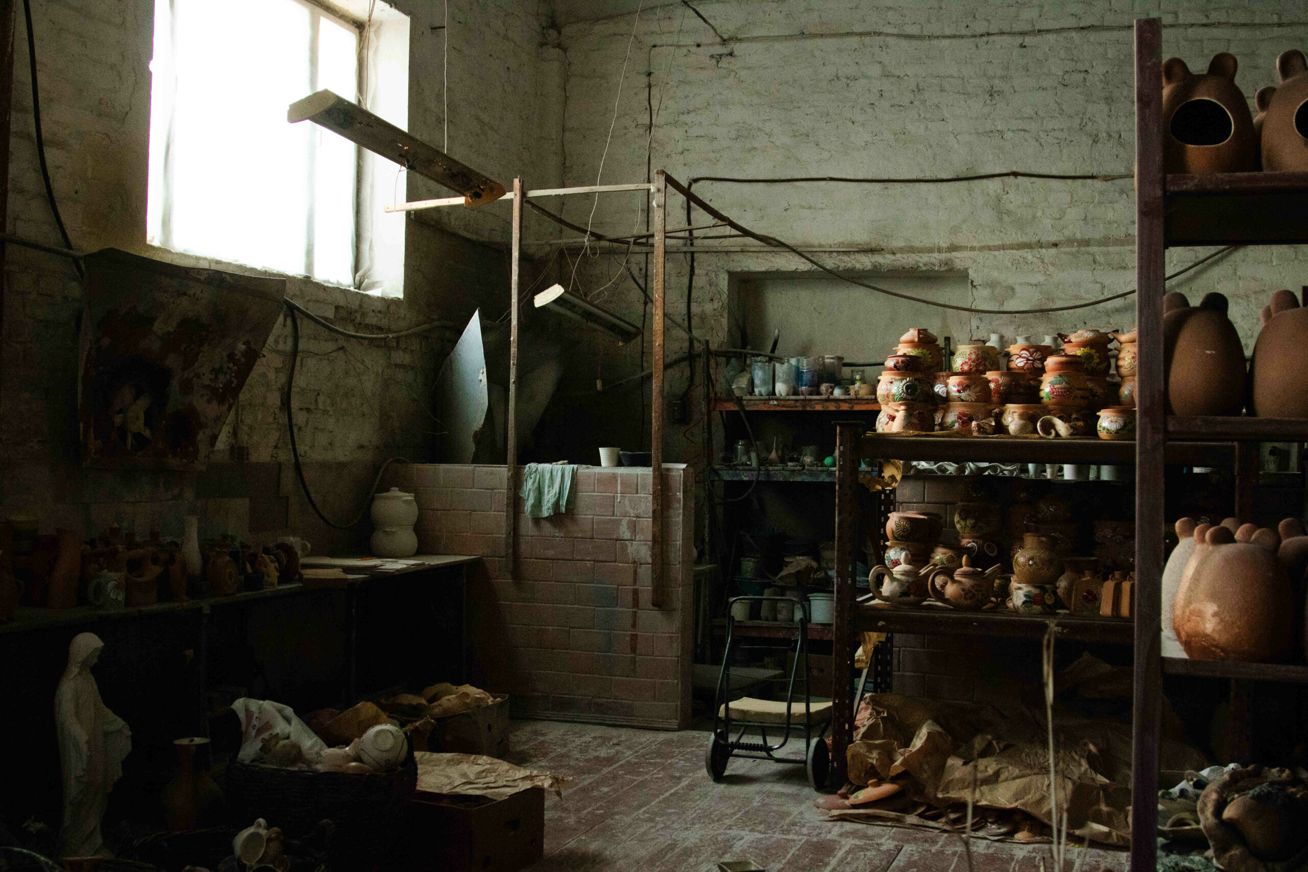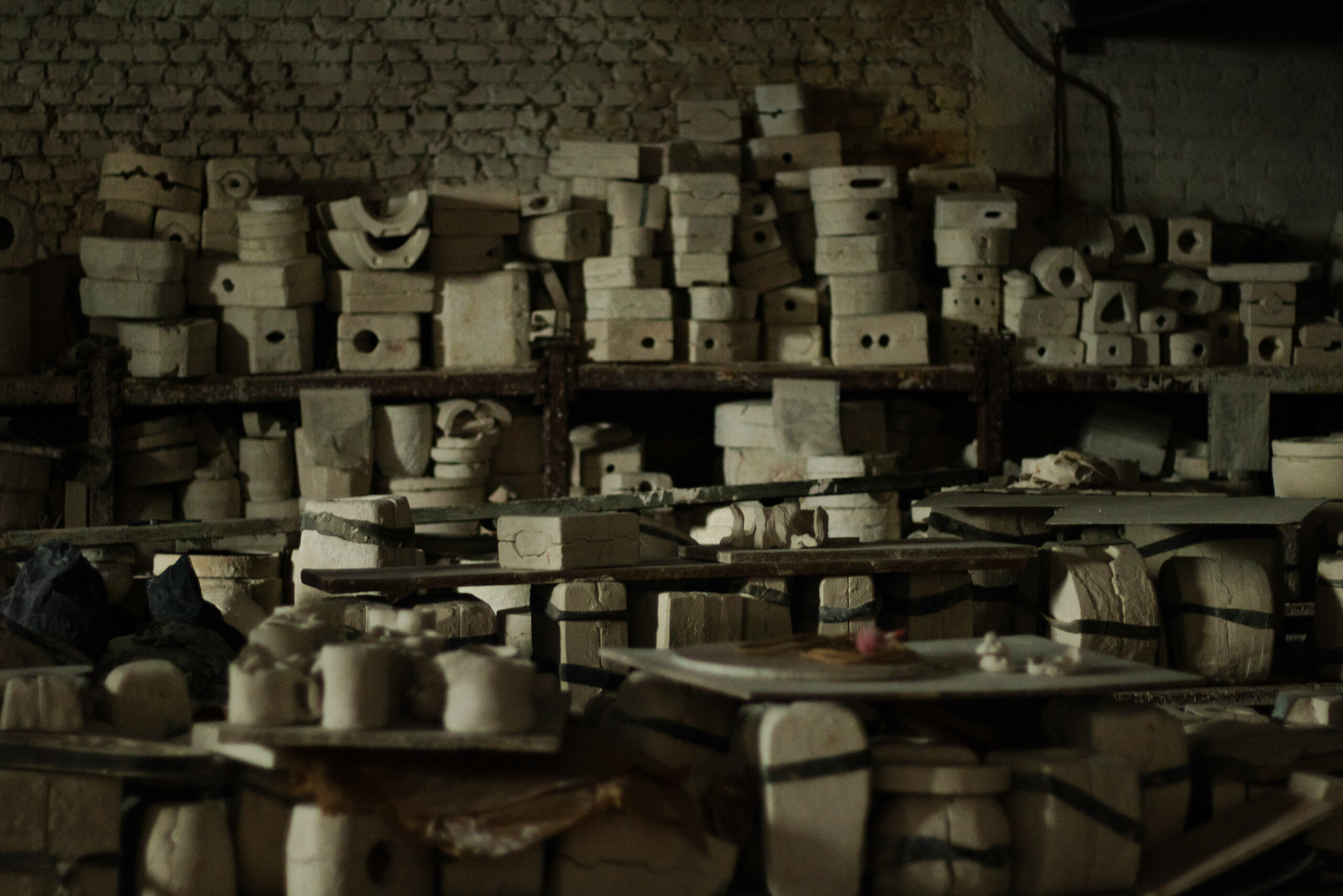 З кожним кроком до наступної локації видніється все більше столів із різноманітними виробами, які ще не пофарбовані: від чашок з вазами до мінімалістичних фігурок. На полицях лежать гіпсові форми, які потрібні для формування глини.