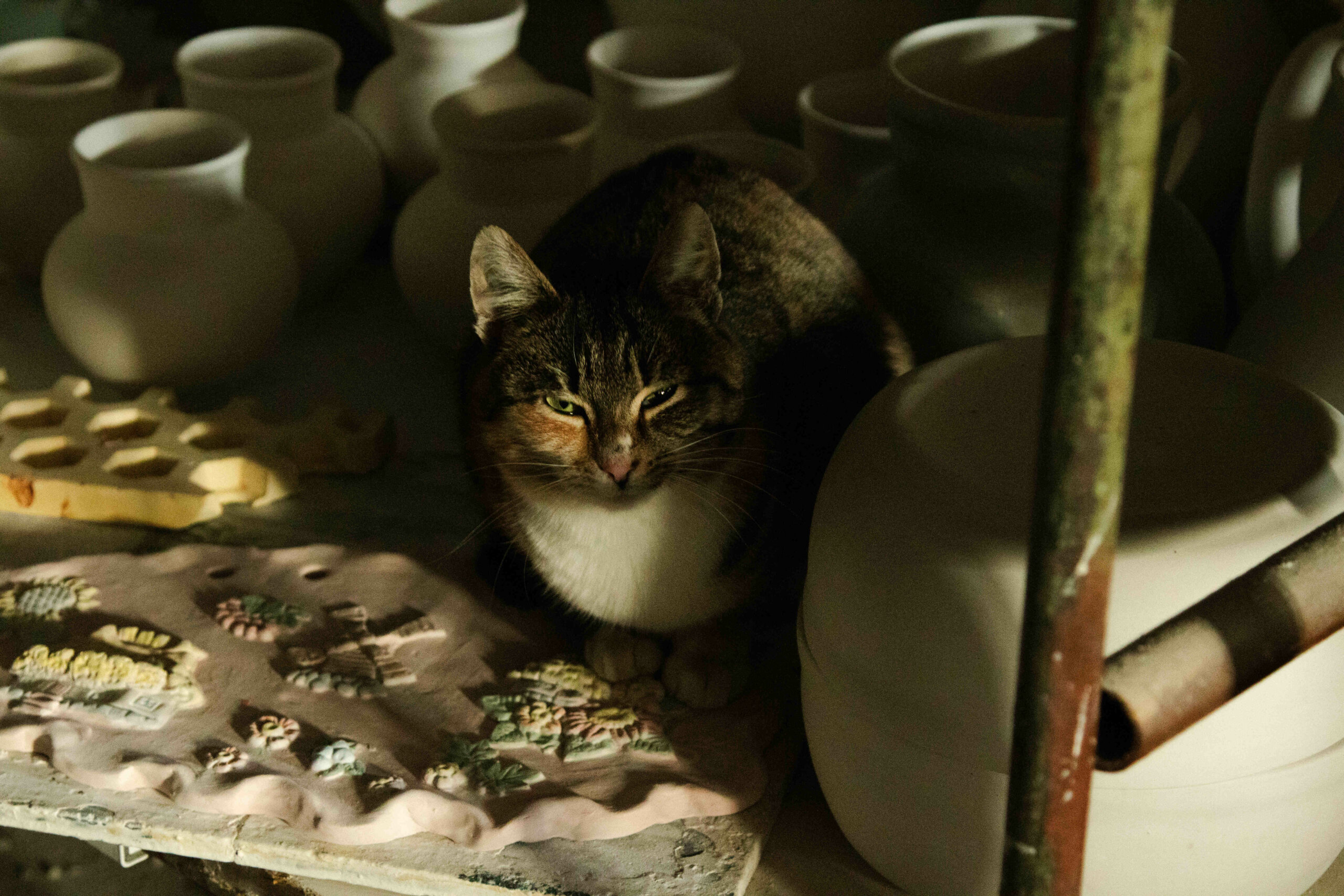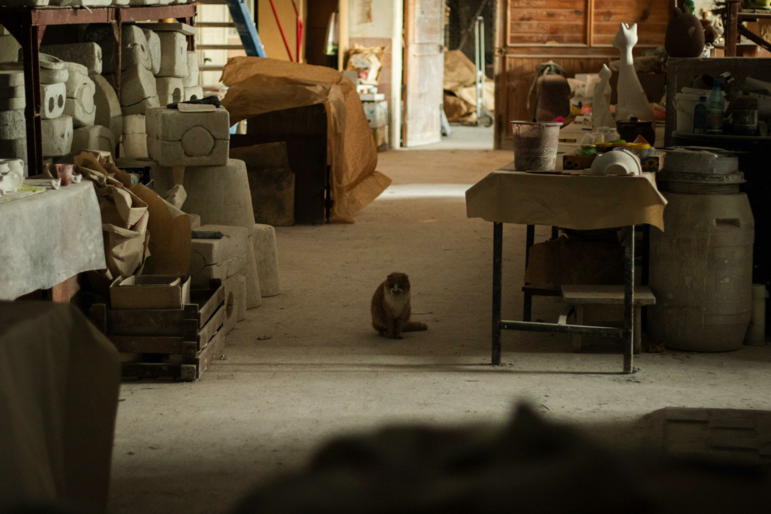 Дорогою до наступної локації серед виробів можна побачити ще одного відвідувача майстерні — кішку Маркізу, пухнасту тваринку власника. Недалеко від неї сидить рудо-білий улюбленець Персик, який спостерігає за кожним рухом у приміщенні.