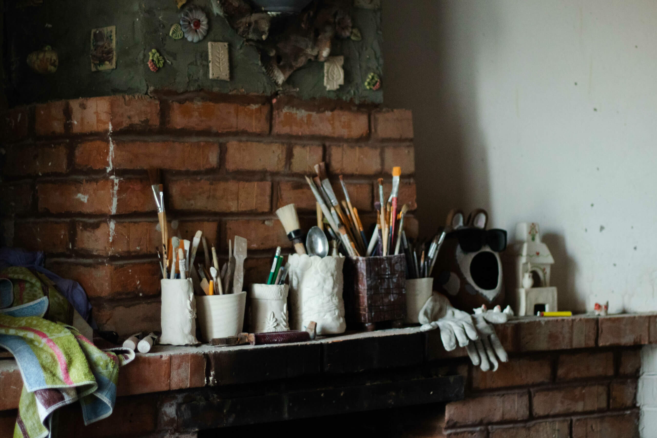 Недалеко від пухнастих улюбленців є декілька кімнат із готовими композиціями — магнітами, вазами, горщиками та різноманітними скульптурами. На столі лежать папери з кресленням виробів та акрилові лаки для їх покриття. Більшість робіт оздоблені кольоровими малюнками та пофарбовані.