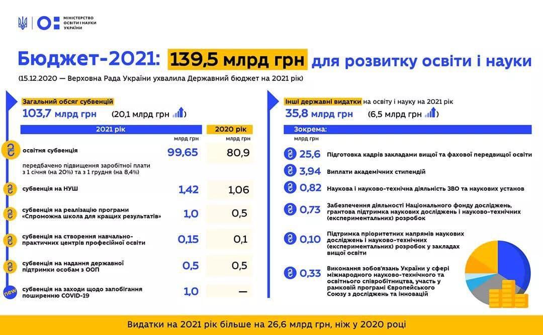 “У Державному бюджеті на 2021 рік Міністерству освіти і науки України передбачені видатки обсягом 139,5 млрд грн, що на 26,6 млрд грн більше, ніж у 2020 році“,— повідомили на сайті Уряду,—”В основному, це кошти на збільшення заробітної плати з 1 січня на 20% та з 1 грудня 2021 року — на 8,4%”.